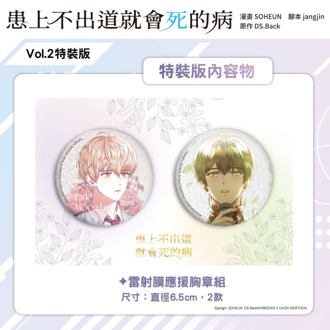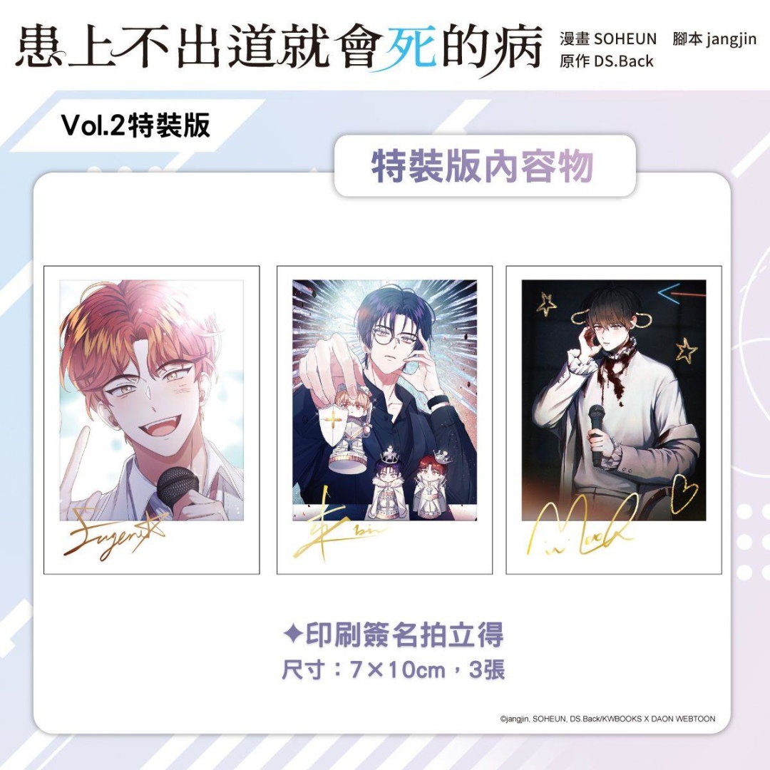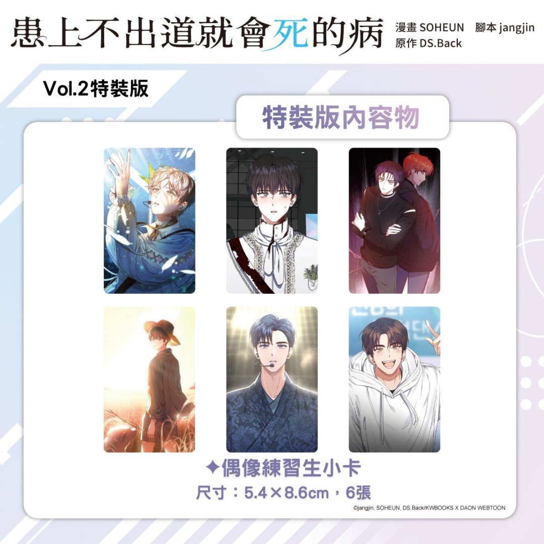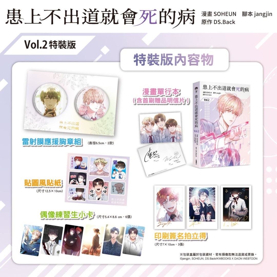 《患上不出道就會死的病2》特裝版收錄特典:製作應援痛包必備「雷射膜應援胸章組(兩入)」、偶像股份有限公司偶像選秀節目的「偶像練習生小卡(六入)」、粉絲必收練習生「印刷簽名拍立得(三入)」、隨貼隨黏「貼圖風貼紙(乙張)」讓練習生們陪你上班上課;以及「漫畫單行本第二集(含首刷限定明信片)」,同齡組的臉頰愛心值得你收藏!《患上不出道就會死的病2》將於 7 月 24 日在 2025 年第 24 屆漫畫博覽會台灣角川攤位及各大通路登場。喜愛《患上不出道就會死的病》的讀者千萬別錯過,一起入股吧!
