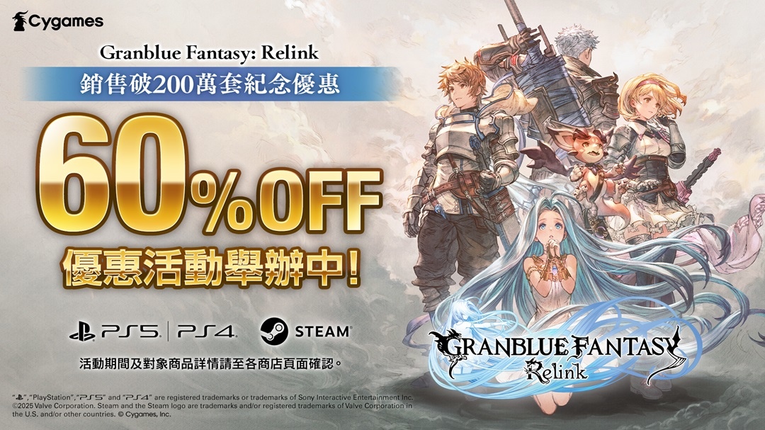 Cygames, Inc. 宣布,旗下 Steam、PS5、PS4 專用動作 RPG 作品《Granblue Fantasy:Relink》(以下簡稱《Relink》),全球累計銷售量已突破200萬套。