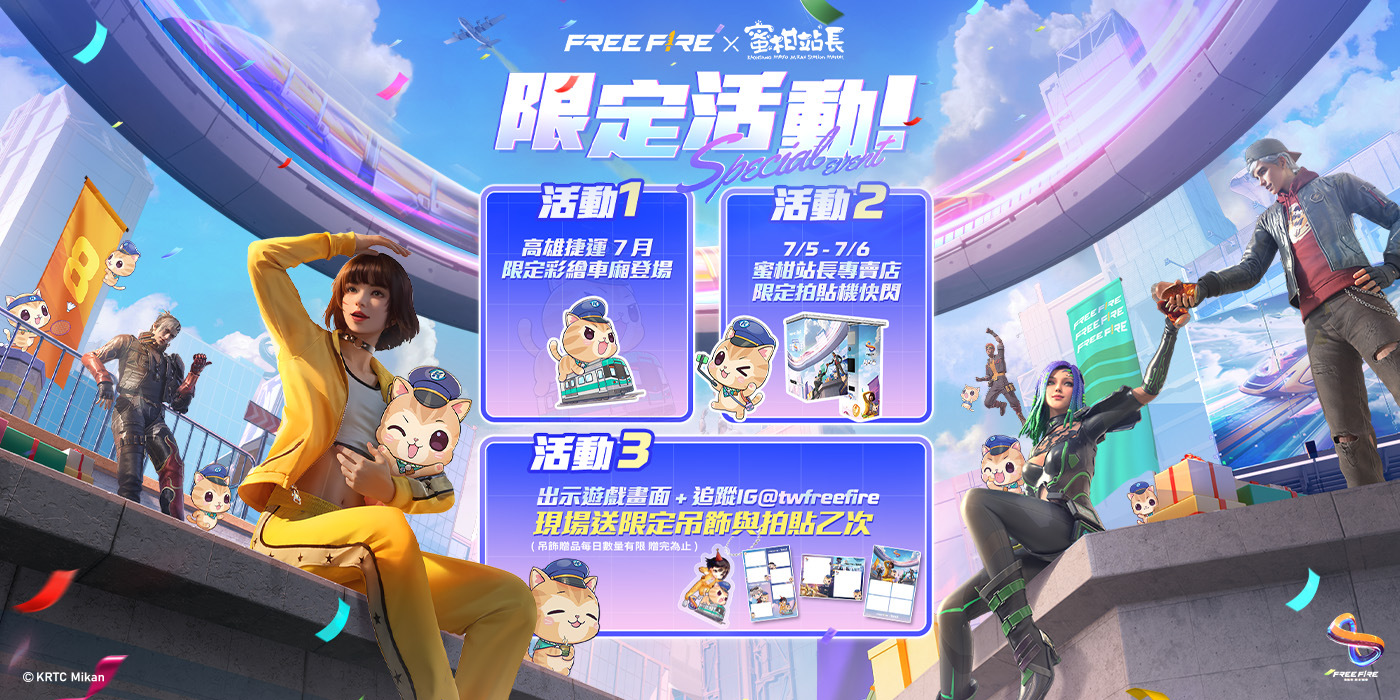 《Free Fire》首次攜手高雄捷運,打造一系列蜜柑主題企劃。「Free Fire 8 週年×蜜柑」聯名彩繪車廂正式啟程,藏身於高雄捷運某列指定車廂內,邀請玩家一起搭上捷運在充滿彩蛋的列車裡尋找蜜柑與《Free Fire》遊戲角色的蹤影。