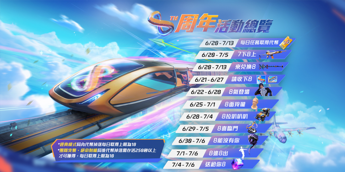 這次 8 週年改版帶來全新玩法與內容,讓對局更刺激、風格更自由!全新「時光空島」開放,玩家可以在地圖中搭乘時光列車進入時光空島戰鬥,獲勝後即可在局內獲得隨機無限道具,大幅提升戰鬥優勢。不只如此,地圖上還會出現「8 週年蛋糕補給」,只要吃下就能立刻拿到武器和資源,跳傘後看準位置,馬上就有物資!