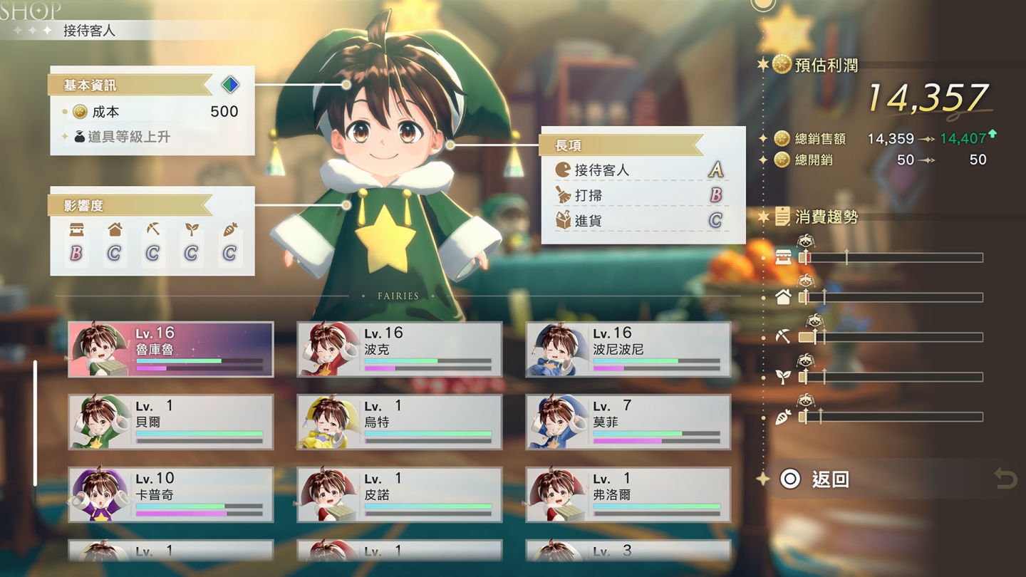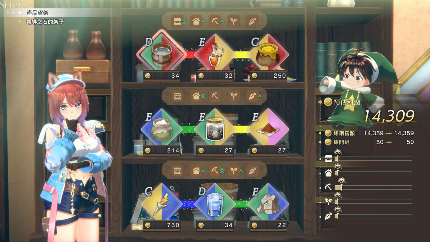 玩家將接手經營莉雅絲祖父的「槲寄生雜貨鋪」,透過販賣素材或調合道具來賺取資金。營業額不僅能用於擴展店鋪、變更裝潢,更可以出資協助赫爾芬城的重建發展。玩家還能雇用在迷宮中遇到的妖精來協助顧店,根據他們不同的能力與個性進行配置,將是提升經營效率的關鍵。