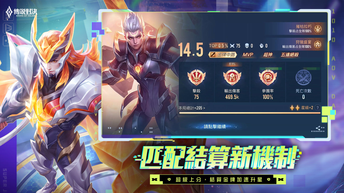 超級傳說日版本導入全新「排位賽積分」制度,取代舊有勇者積分,並把原有「金銀牌職業」全面升級為「金銀牌分路」,讓評分更貼近實戰表現。對局中玩家若獲得金銀牌將依表現增加積分,有機會在勝利時得到雙星,也有機會失敗時不掉星。新機制提供更即時、更公平的評分回饋,期待能帶給所有認真參與對戰的玩家更好的遊戲體驗。
