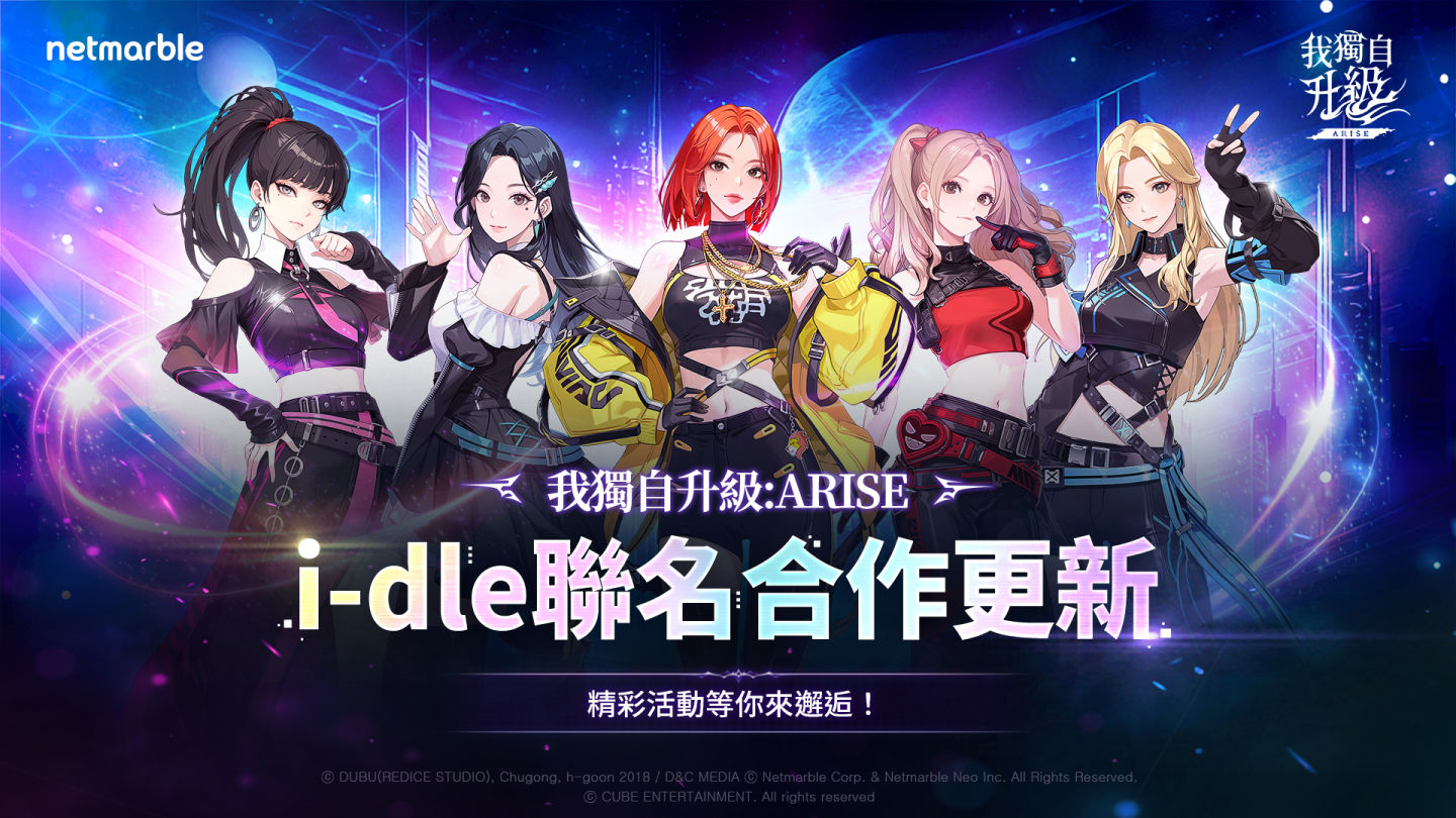 為慶祝此次與「i-dle」的聯名合作,《我獨自升級: ARISE》推出多項遊戲內活動。玩家透過「聯名通行」可解鎖 MIYEON 和 SHUHUA,完成活動故事與每日任務可獲得額外獎勵。活動包含「i-dle 獵人 PICK UP 紀念!幸運輪盤」,玩家可製作 MIYEON 和 SHUHUA 的專屬武器;「戰場之星!簽到禮物」活動則提供每日登入獎勵。