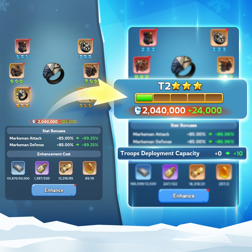 「領主裝備」的提升方式也有所改善,神話級裝備在不改變總需求量的情況下,每星等細分成數個階段,只要達到階段目標即可立刻獲得屬性提升;且傳說三星以上裝備,還將新增屬性出征部隊數量這項重要的屬性,提升玩家的遊戲體驗。
