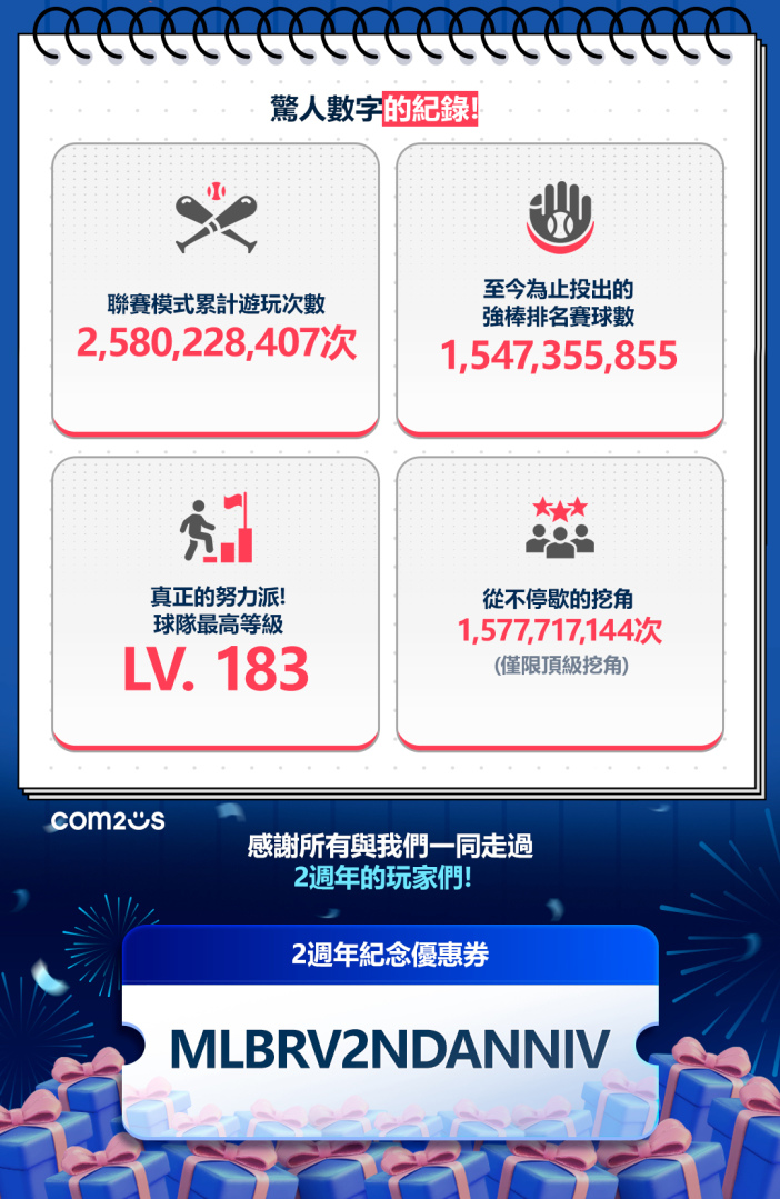 Com2uS 旗下全球人氣手遊《MLB 勁旅對決》為迎接上市 2 週年,將舉辦大型慶祝活動。