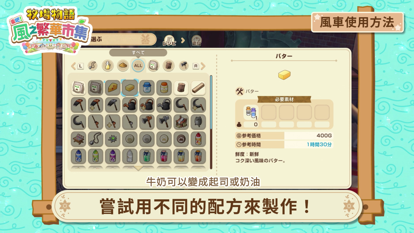 本作的「風」系統為一大特色,鎮上的風車能將農產品與大自然的恩惠加工成多樣製品,例如將牛奶與薄荷加工成優格。風力越強,加工速度越快。此外,遊戲新增了全新的「空中」移動方式「滑翔翼」,玩家可利用滑翔翼前往平時無法到達之處,或借助木桶彈跳、從高處躍下等方式,在強風助益下進行更快的飛行探索。