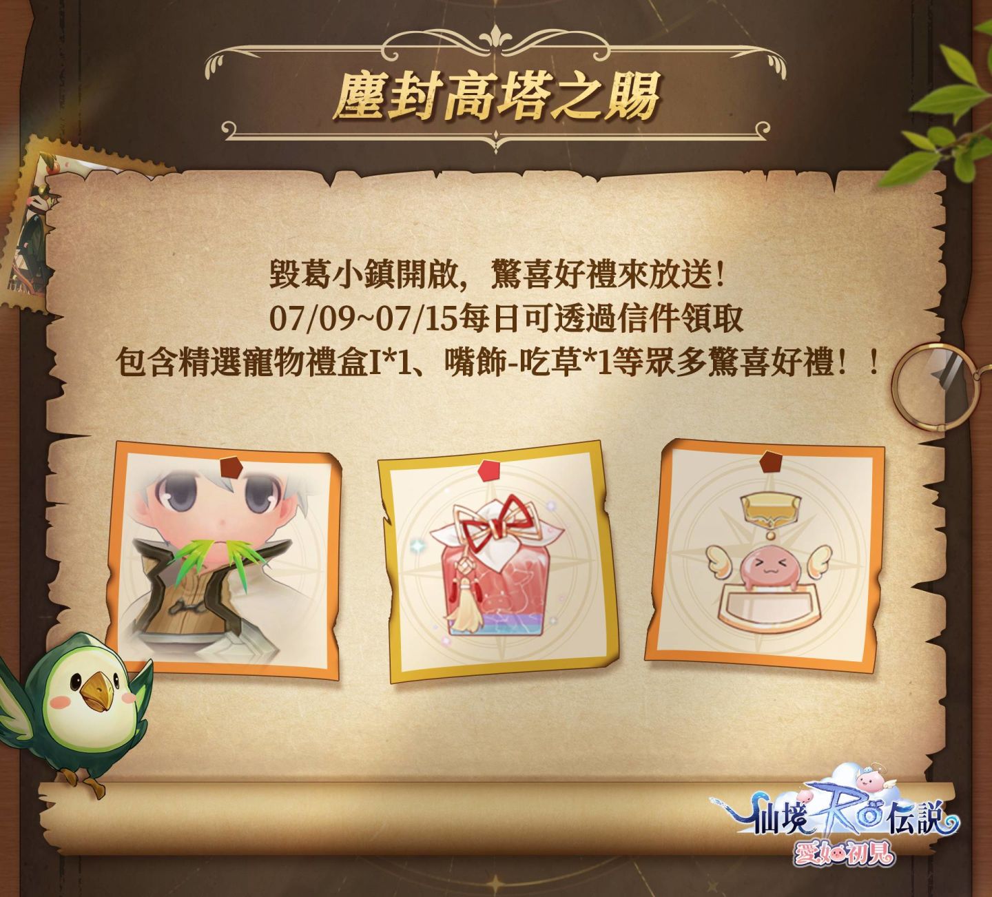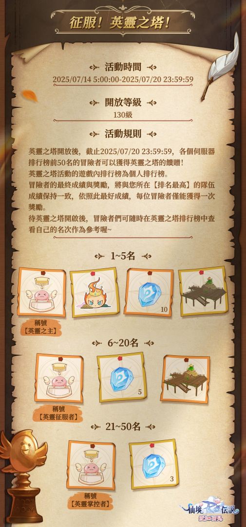 塵封高塔之賜,改版豪華獻禮等你領!7 月 10 日至 7 月 16 日,每日登入都可以領取不同福利好禮。所有冒險者不僅可以領取毀葛禮物「限時傳說寵物自選箱」,可從「牛頭人鼓手」、「神兔歡歡」、「安塔夏β型」、「福金」、「霧尼」、「該隱」、「哈提」中選擇,共同開啟全新冒險,還有嘴飾、專屬稱號、遊戲貨幣、養成材料等大量遊戲道具獎勵發放,福利滿滿,讓你拿到手軟!