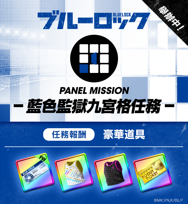 舉辦九宮格任務活動,1 張列表中有 9 個任務格,只要完成 1 項任務就能獲得獎勵道具。此外完成共 9 個任務便視為達成所有任務。本次的「藍色監獄聯動紀念九宮格任務」中,可獲得能在《藍色監獄》聯動限定轉會特訓目的地「藍色監獄」使用的「藍色監獄轉會特訓券 FW 系列」和「保證★5 發掘券」等豪華獎勵。