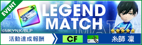 「LEGEND MATCH」為同 LEGEND 球隊對戰,取得勝利可獲得相應點數,累積到一定量後便可獲得豪華道具。本次 LEGEND MATCH 中 10,000pt 達成獎勵之★5 球員更替,不但有來自《藍色監獄》的新★5 球員「糸師凜」登場,還可獲得能在《藍色監獄》聯動限定轉會特訓目的地「藍色監獄」使用的「藍色監獄轉會特訓券 FW 系列」。