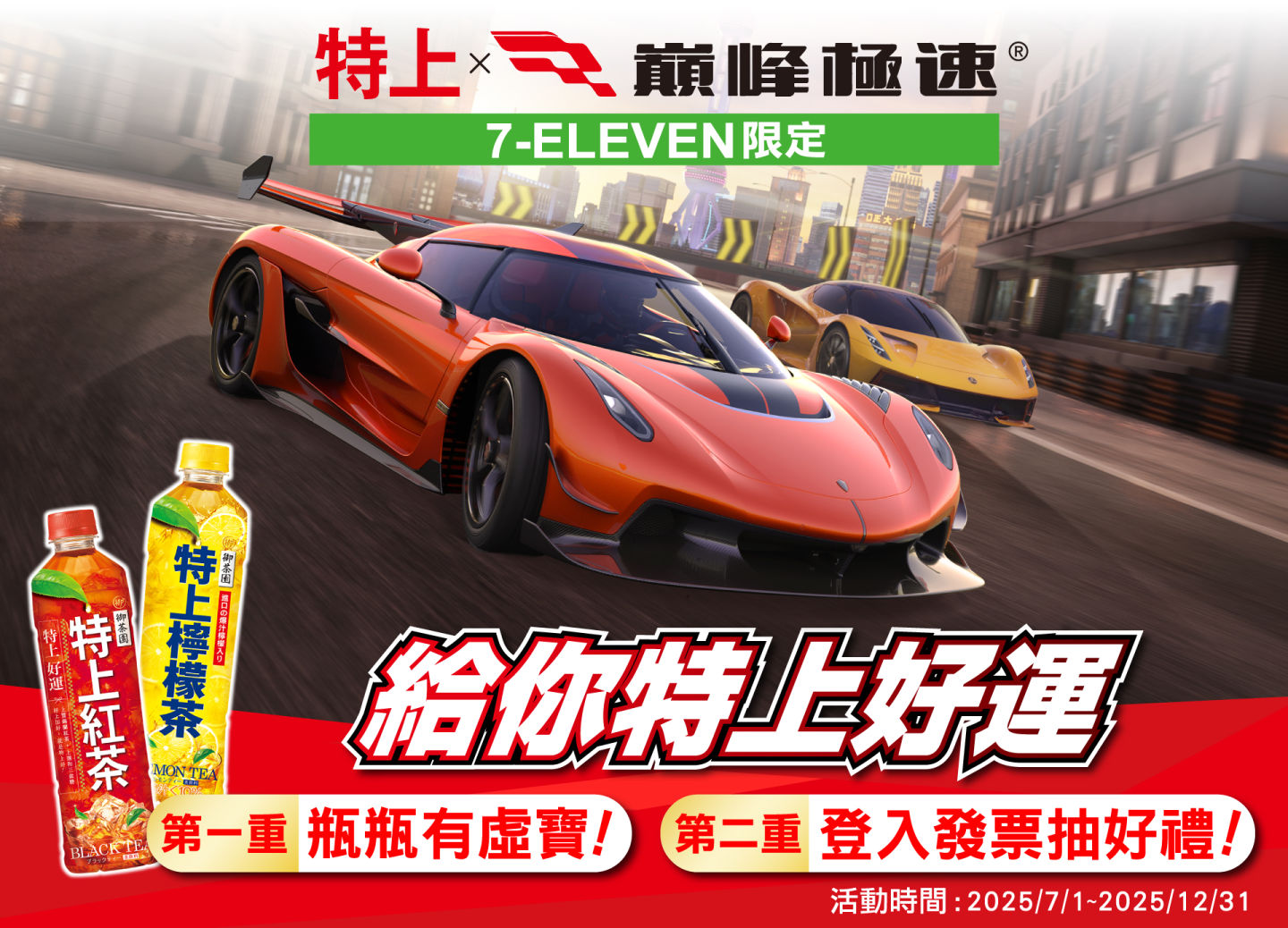 為迎接 S5 車手季來臨,《巔峰極速》與御茶園聯名打造「給你特上好運」活動,即日起至 12 月 31 日於全台 7-ELEVEN 門市獨家販售御茶園特上紅茶、特上檸檬茶金蓋 550ml《巔峰極速》聯名瓶貼款,開蓋即可獲得虛寶序號,瓶瓶都有獎!
