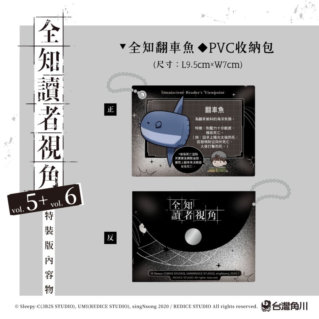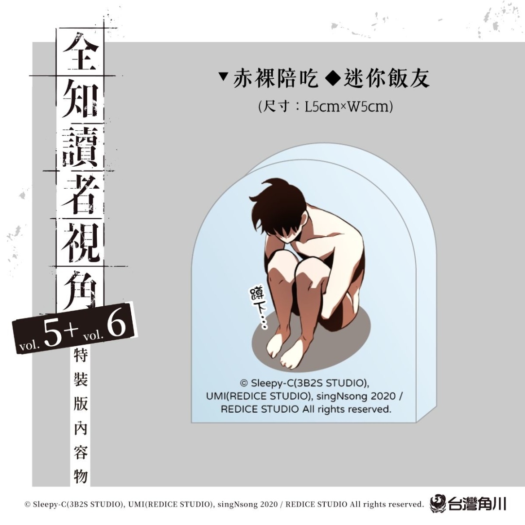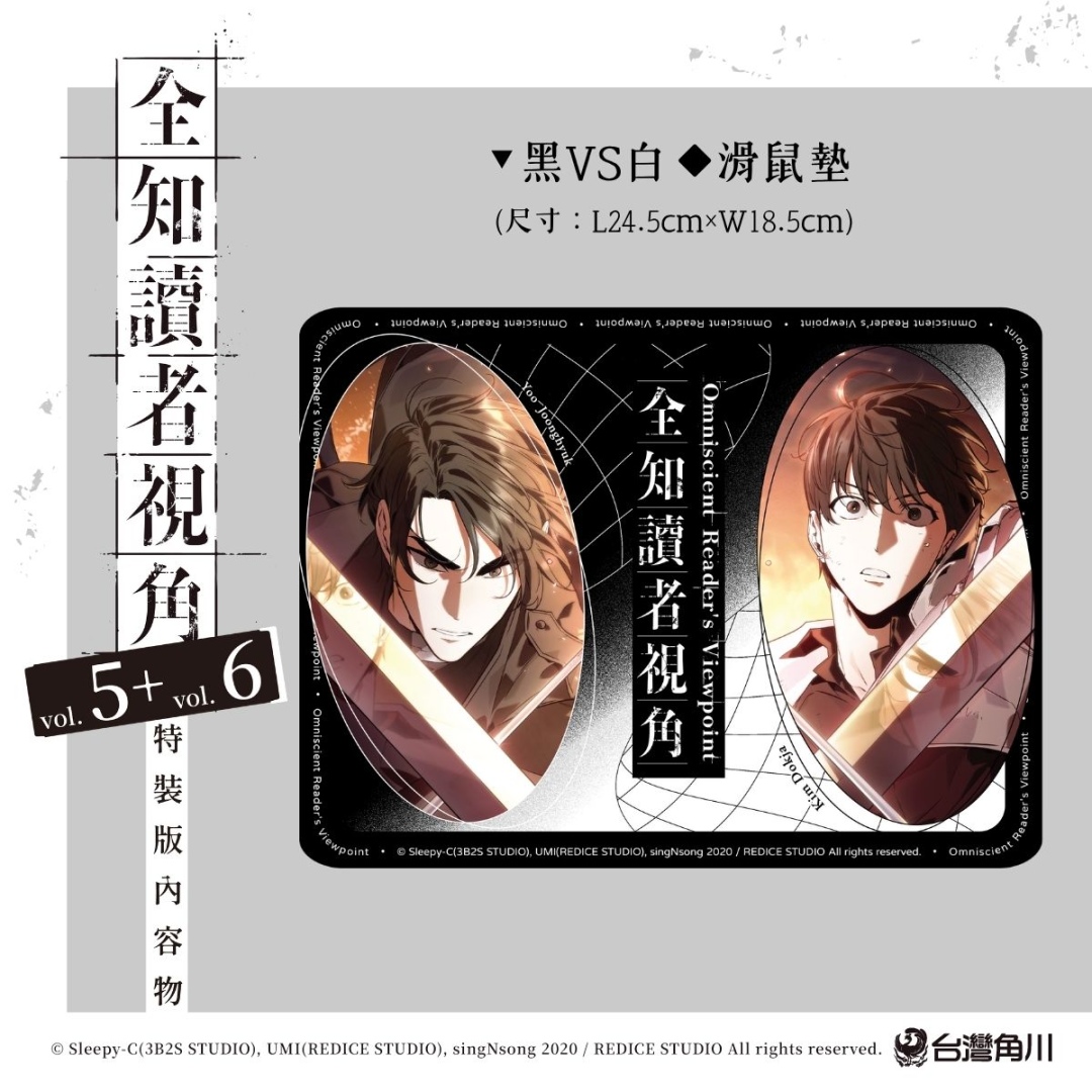 《全知讀者視角【5+6特裝版】》精心收錄多項珍貴特典:緊張氣氛一觸即發的「黑VS白◆滑鼠墊」、隨時陪你吃遍天下的「赤裸陪吃◆迷你飯友」、兼具可愛與實用性的「全知翻車魚◆PVC收納包」,以及首刷附贈「經典場景明信片」的《全知讀者視角》(5)、(6)單行本,所有內容將收錄於「特裝版珍藏書盒」內。