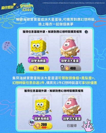 蒐集完成「海綿寶寶蛋」與「派大星蛋」造型,不僅可獲得頭像框「鳳梨屋」,還可以解鎖甜夢幻想時裝「甜夢海綿蛋」或「甜夢派大星蛋」,以及甜夢幻想時裝專屬五折折扣券!換上柔軟的睡衣,戴上星星與雲朵點綴的小睡帽,一起做個香甜的美夢吧!