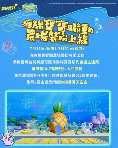 想體驗「住在深海的大鳳梨裡」的感覺嗎?這次聯動驚喜升級!農場裝扮將同步更新,海綿寶寶農場套裝降臨蛋仔島!參與農場裝扮祈願可獲得海綿寶寶系列自選主建築、農場裝扮、門牌裝扮及大門裝扮。