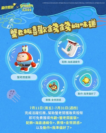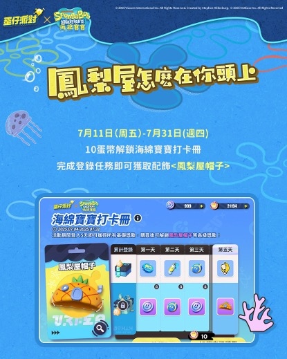 另外,聯動活動「蟹老闆的金庫」將同步開啟,參與活動即可免費領取外觀「蟹老闆套裝」、配件「海底通緝令」、動作「我準備好了」、表情「金幣誘惑」等豐厚好禮。只需 10 蛋幣解鎖海綿寶寶打卡冊的活動同步上線!完成登入任務還能領取配件「鳳梨屋帽子」,一起把大鳳梨戴在頭上,開啟蛋仔島的快樂每一天吧!