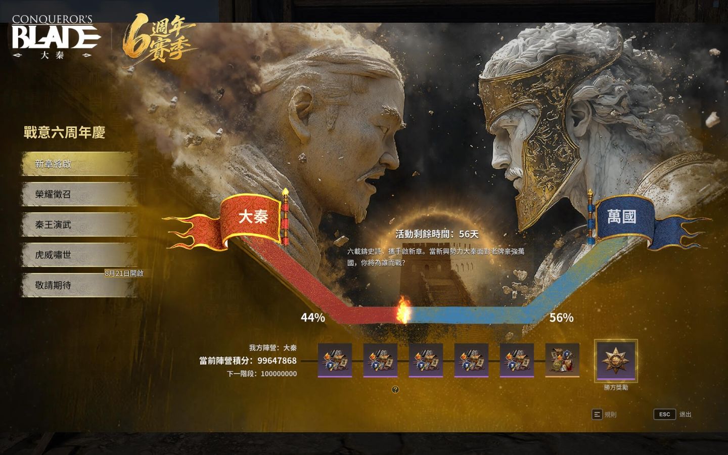 「大秦 vs 萬國」週年慶主題對抗活動正式展開!玩家可在「大秦」和「萬國」兩大陣營中選擇一方加入,參與玩家可以透過「榮耀積分」、「遊戲匹配玩法」和「排位賽玩法」等方式,為所屬陣營累積勢力值。