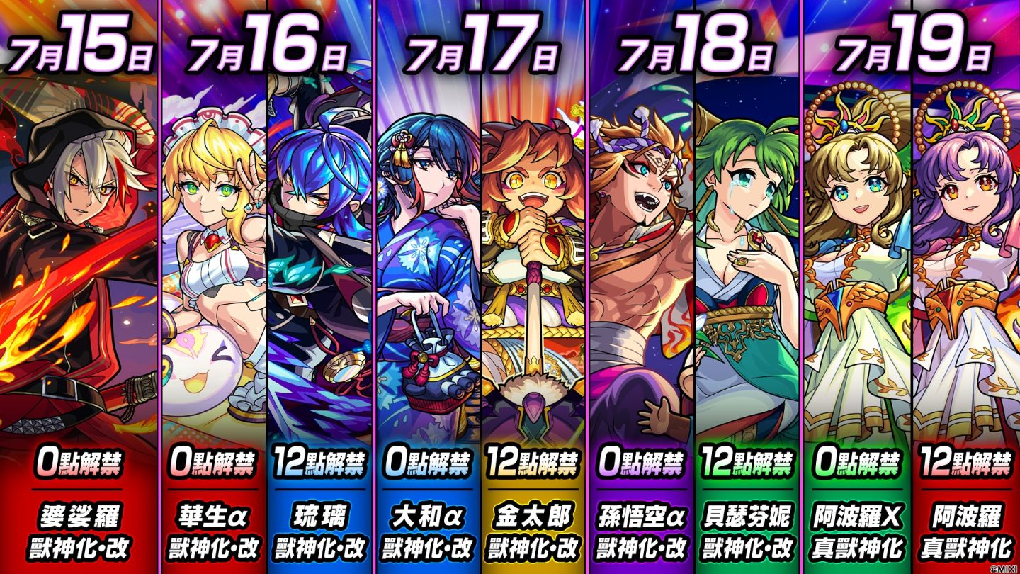 備受矚目的妮奧「獸神化・改」將正式解禁,並有 MV 造型「妮奧:Resonance模式 MV」和新年造型「妮奧:First Sunrise模式」同步登場。販售妮奧的轉蛋「怪物彈珠精選角色DX ~妮奧篇~」將於 7 月 14 日開跑。此外,自 7 月 15 日起,將連續五天,每隔 12 小時解放一次角色的「真獸神化」或「獸神化・改」形態,玩家可密切關注官方公告。