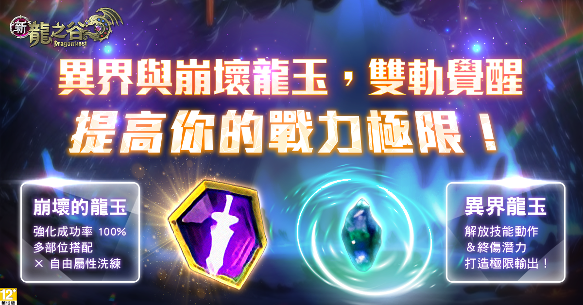同步新增兩款全新龍玉道具「崩壞龍玉」及「異界龍玉」。崩壞龍玉可於「崩壞的次元裂縫」中取得,具備隨機詞條與基礎能力提升效果,強化角色基礎能力;異界龍玉則綁定副武器部位,專門針對一轉技能進行強化,除了數值提升之外,更會解鎖專屬技能動畫與特效,兼顧養成效率與視覺感受。
