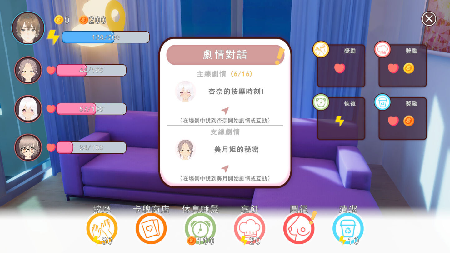 你因緣際會成為一名實習管家,遇到了三個性格迥異的女孩。這些女孩不懂家務又恰巧很喜歡按摩,好好服務她們,也許你會得到意想不到的收穫。