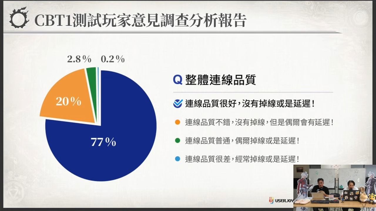 玩家對於整體的連線品質給予高度滿意。有高達 77%的玩家認為連線品質「很好,沒有任何掉線或延遲」,另有20%的玩家覺得「不錯」,整體滿意度高達 97%。官方指出儘管仍有少部分玩家反映連線延遲。