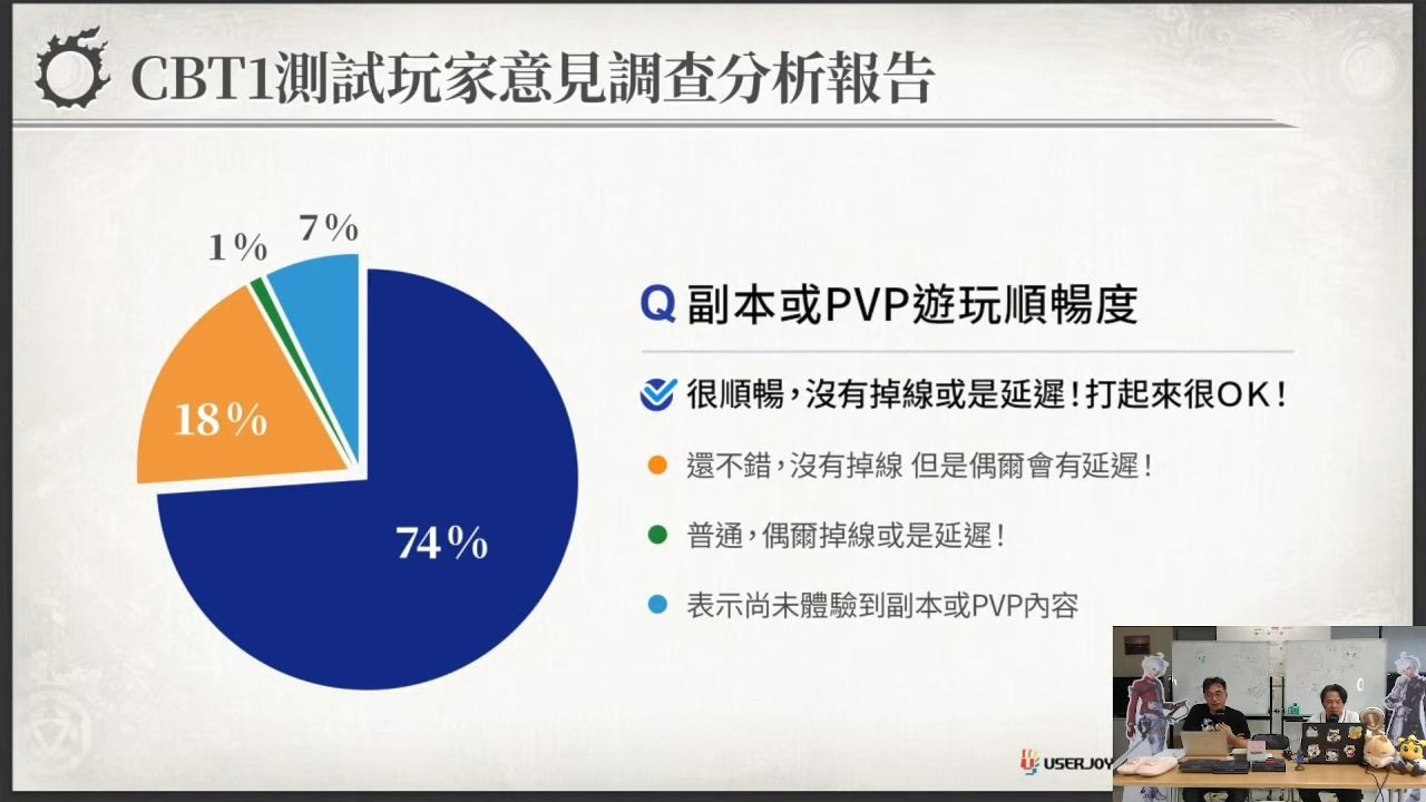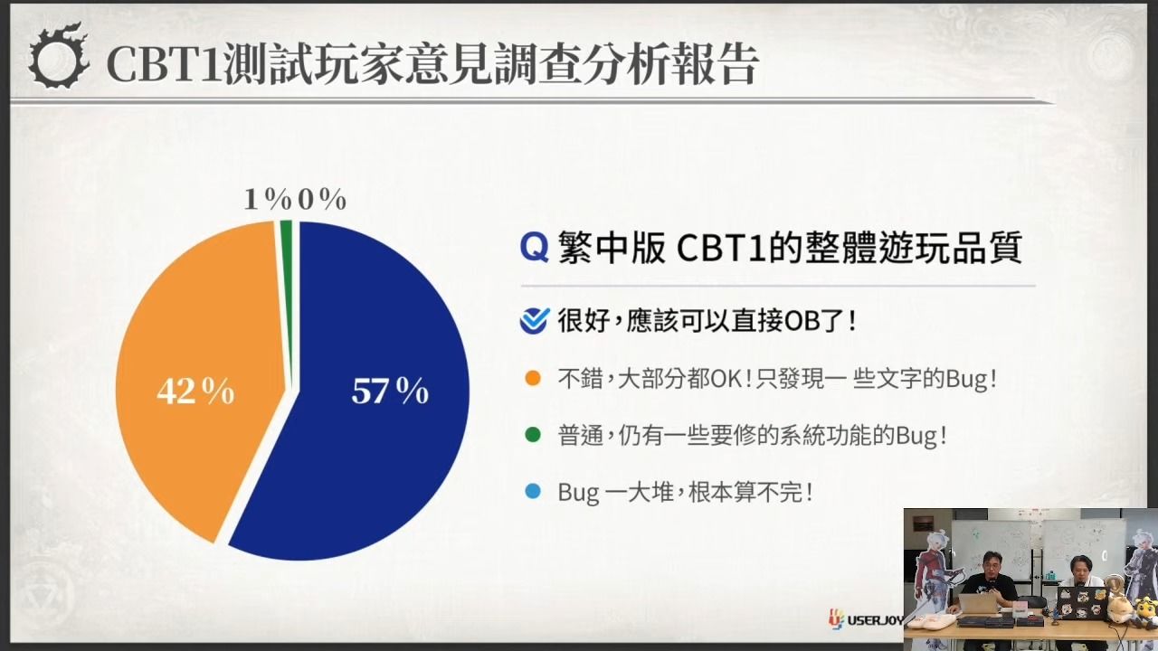 綜合 CBT1 整體表現,17% 的玩家認為遊戲品質「OK,可以直接上線」,42%的玩家認為「沒有太大問題」,總計99%的玩家對CBT1的測試品質表示滿意。若以10分滿分計算,繁中版的平均得分約為 8.97 分