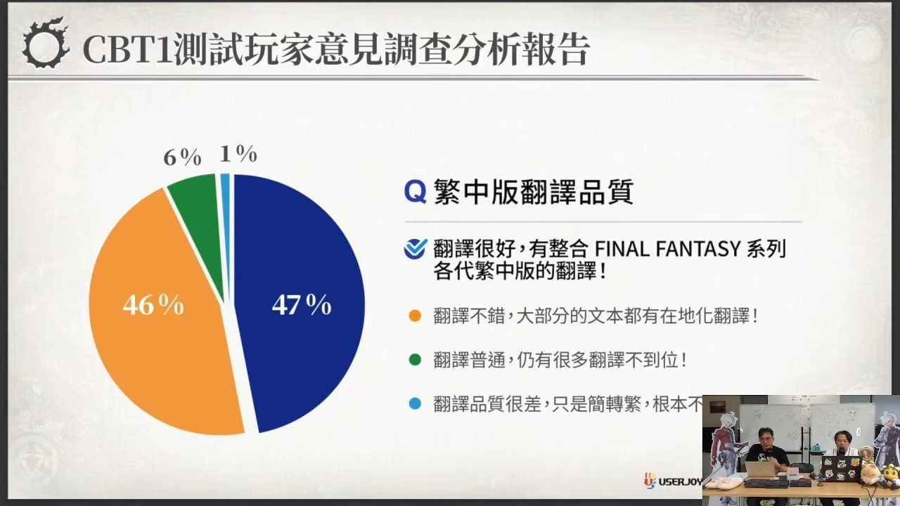 在遊戲流暢度方面,玩家普遍認為副本與PvP的遊玩體驗「流暢」。此外繁中版的翻譯品質也獲得了廣泛認可,有46%的玩家認為翻譯「很好,有整合系列的感覺」,另有47%的玩家認為「不錯,大部分的文本都有在另外翻譯」,總計 93% 的玩家對翻譯品質表示滿意。官方強調,所有遊戲內名詞與翻譯皆遵循SE原廠提供的官方繁體中文翻譯詞表。對於問卷中提及的少量文字錯誤、錯字或疊字問題,團隊承諾將在下次測試中進行修改。