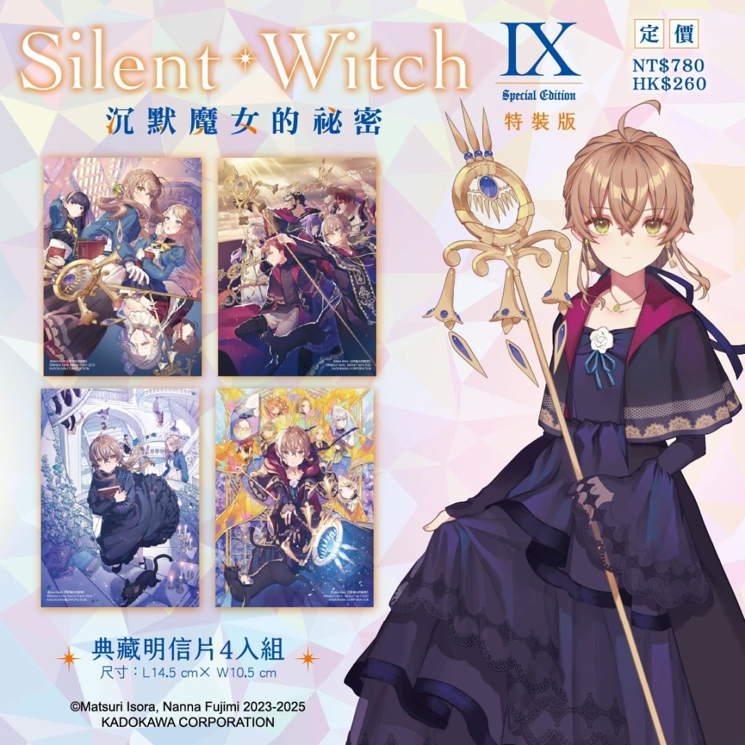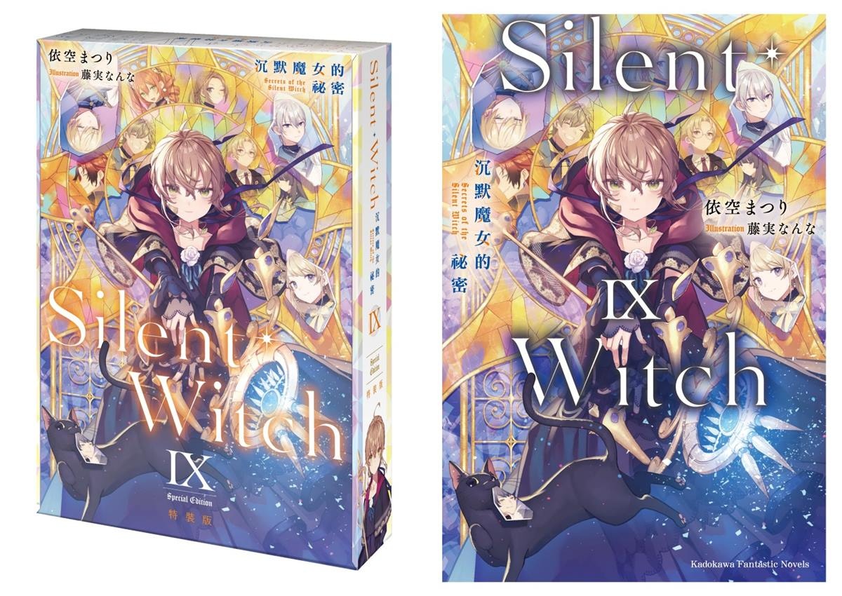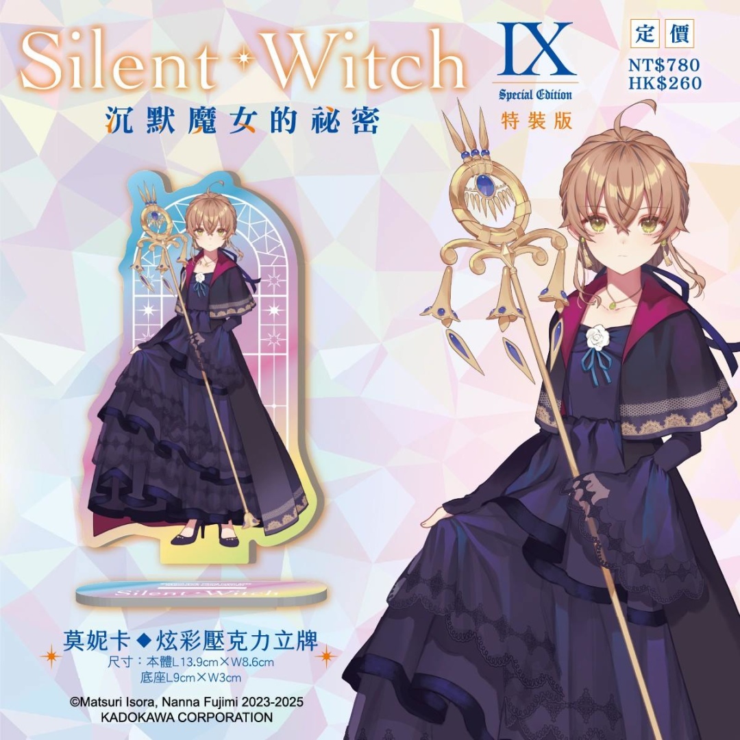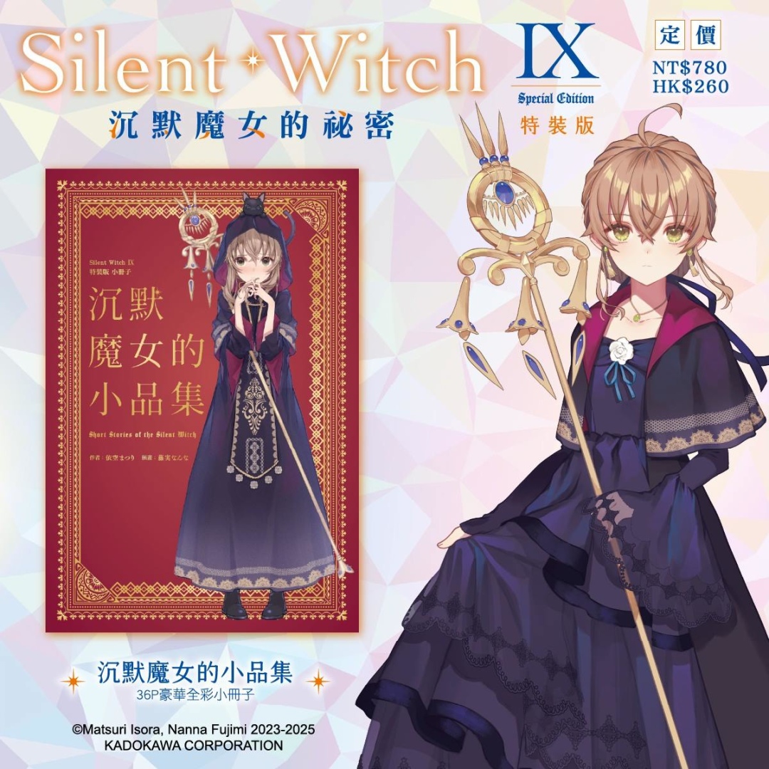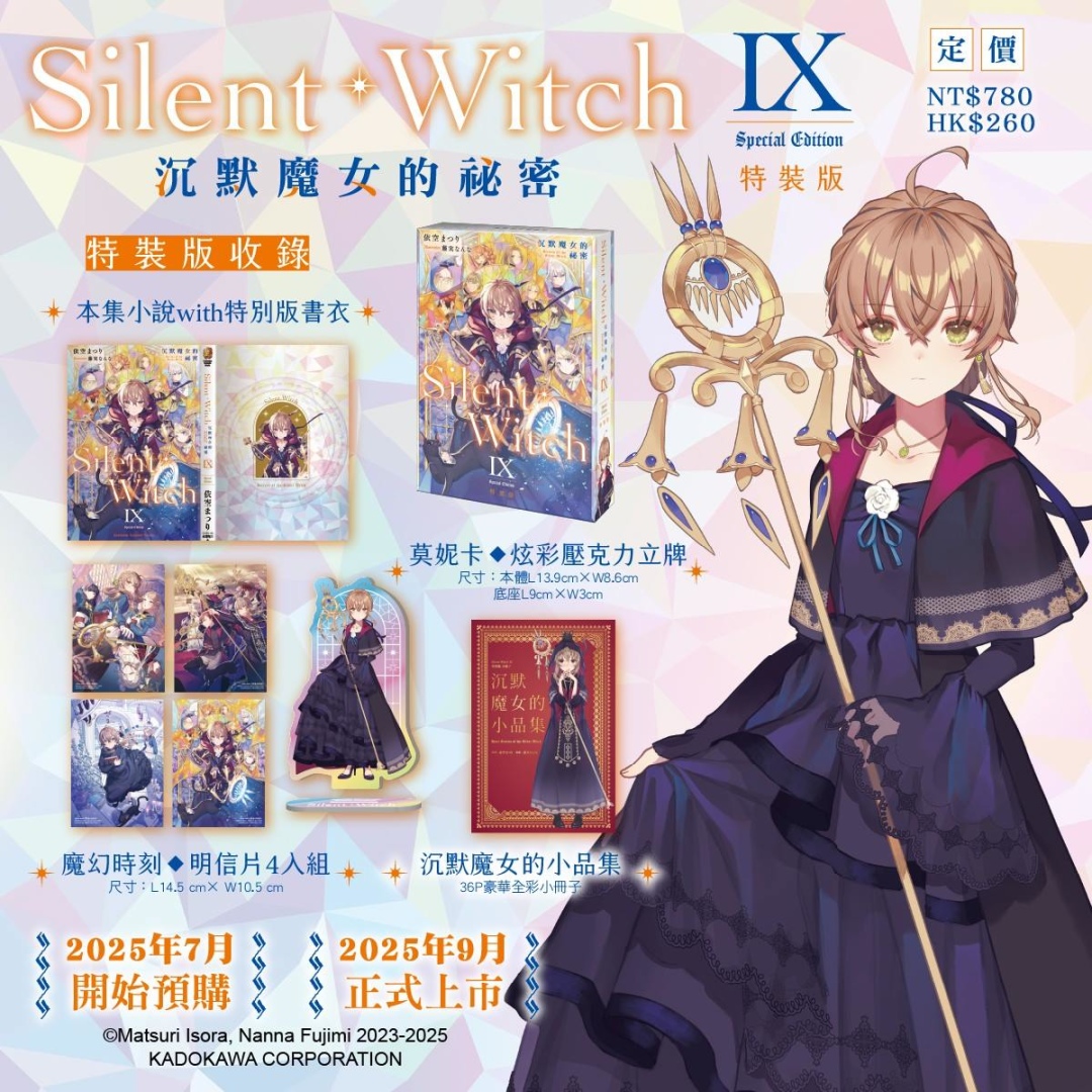 《Silent Witch (9) 沉默魔女的祕密》特裝版收錄限定特典──「沉默魔女的小品集:36 P豪華全彩小冊子」作者依空まつり老師特別撰寫對話形式的極短篇共 22 篇,極度社恐的天才魔術師莫妮卡展開不為人知的精彩冒險;「莫妮卡◆炫彩壓克力立牌」立於利迪爾王國魔術師頂點的七賢人之一<沉默魔女>展現霸氣樣貌;「魔幻時刻◆明信片 4 入組」收錄多款莫妮卡與夢幻小夥伴們的經典場景特繪;及「本集小說 with 特別設計書衣」皆收錄於「特裝版珍藏書盒」,請讀者朋友把握事前限期預購機會以免向隅。