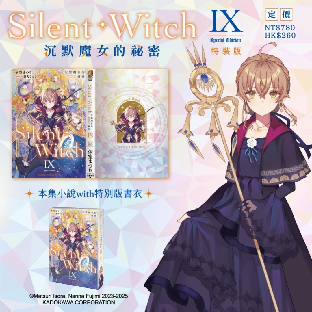 榮獲「這本輕小說真厲害!2022」單行本部門第 2 名,由依空まつり著作,藤実なんな繪製插圖的暢銷輕小說《Silent Witch 沉默魔女的祕密》,故事講述世上絕無僅有的無詠唱天才魔術師,其真面目竟是極度怕生的社恐家裡蹲!動畫播出後深獲好評,社群話題不斷!台灣角川將於今年九月推出《Silent Witch (9) 沉默魔女的祕密》並同步發售收錄特典小冊子及多款主角莫妮卡超萌週邊的【特裝版】,即日起至 8 月 6 日(三)開放限期預購。活動期間凡於台灣角川官方購物網完成預購,再加碼贈送官網購物金 100 元。