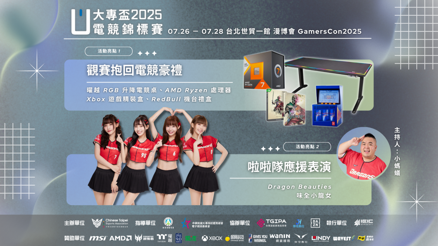 本屆賽事陣容強大,將頒發總價值超過 70 萬元的獎金與頂級電競周邊,更邀請到林襄與 Yuri 領軍的小龍女啦啦隊擔任表演嘉賓,為電競賽事應援打氣、注入滿滿青春活力!