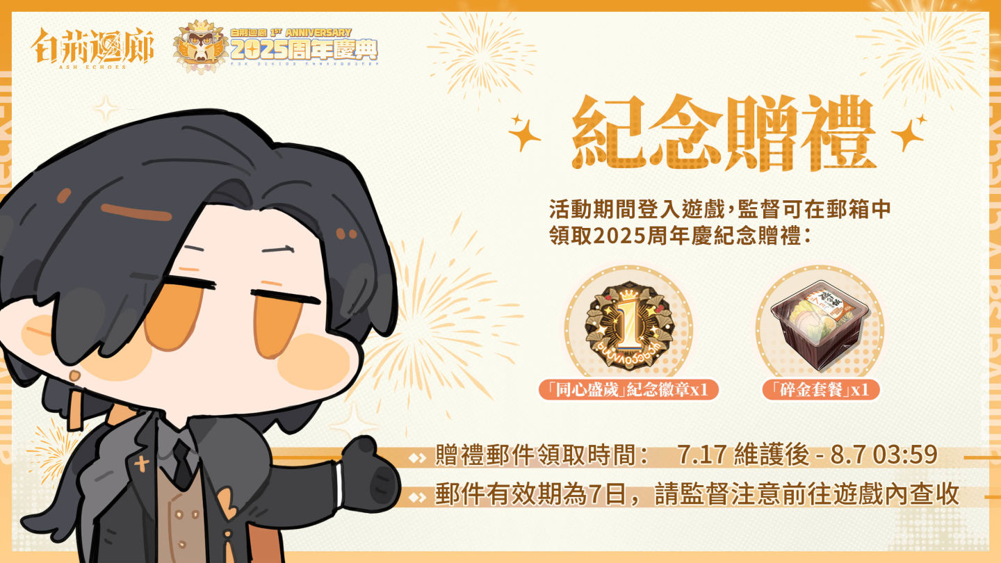 活動期間登入遊戲可在郵箱中領取 2025 週年紀念贈禮;「同心盛歲」紀念勳章×1、「碎金套餐」×1。