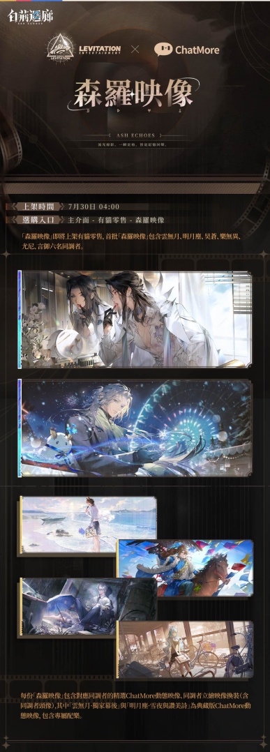「森羅映像」即將上架有貓零售,首批「森羅映像」包含雲無月、明月塵、昊蒼、樂無異、尤尼、言御六名同調者。「森羅映像」包含對應同調者的精選 ChatMore 動態映像、同調者立繪映像換裝(含同調者頭像),其中「雲無月・獨家幕後」與「明月塵・雪夜與讚美詩」為典藏版 ChatMore 動態映像,包含專屬配樂。