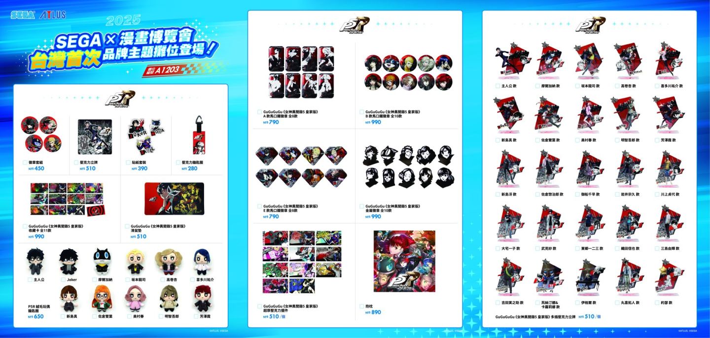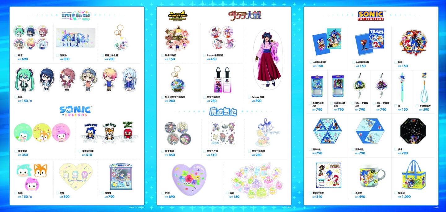 在本次活動中,SEGA 將於物販攤位販售多款人氣作品的全新周邊商品,包括:《Sonic》、《Sonic & Friends》、《世界計畫繽紛舞台!feat. 初音未來》、《魔法氣泡》、《櫻花大戰》、《超級猴子球》以及《女神異聞錄5 皇家版》等等,豐富商品等您來蒐藏帶回家!