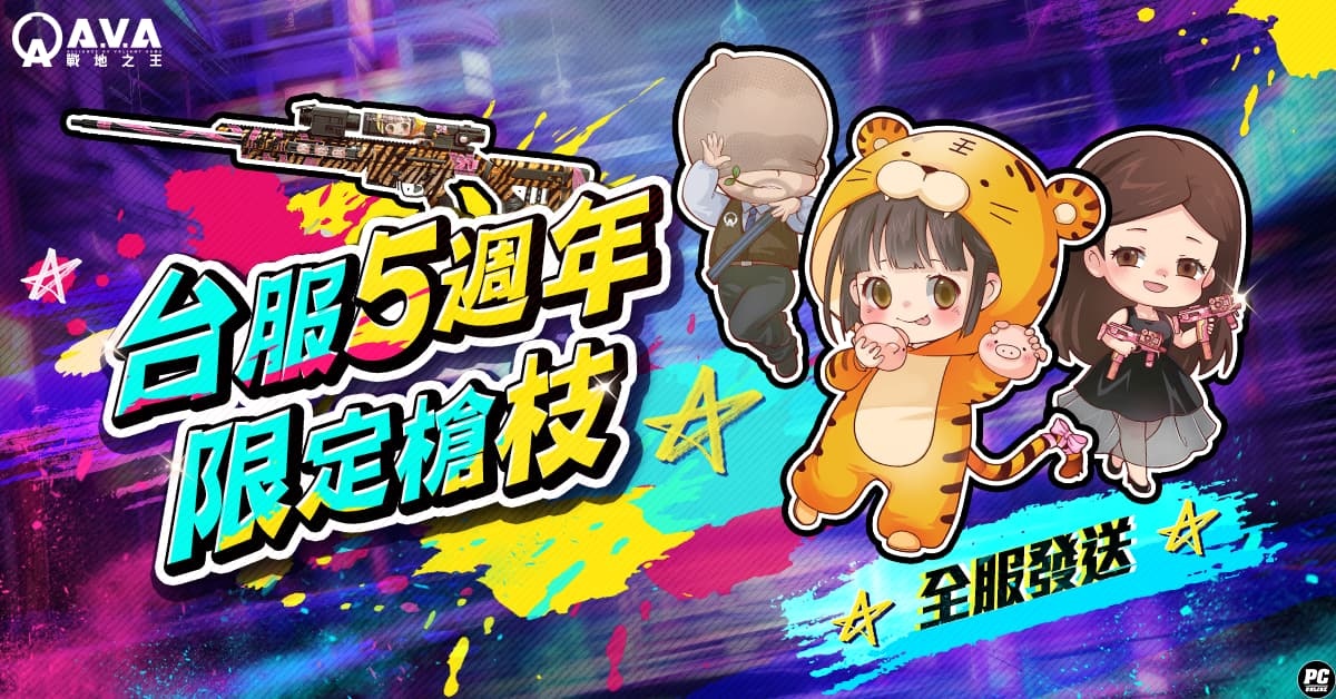 豐富贈獎內容不僅於此,為歡慶五週年到來,遊戲原廠 Neowiz 特地以台版 GM 形象為設計元素,推出台版限定的獨家造型槍枝,包括「PSG of WoRoar 讓窩打一下」、「Athena Precision Chassis Rifle MM2 曼烤鳳梨槍」與「M4 Spectre Ben 我有一把好大的槍」,三把槍恰好對應偵察、步槍、狙擊各一兵種,並將採全服發送的方式送給每一位戰地菁英,一同慶祝這值得紀念的時刻,《A.V.A 戰地之王》忠實玩家們,現在就登入遊戲領取收藏吧!