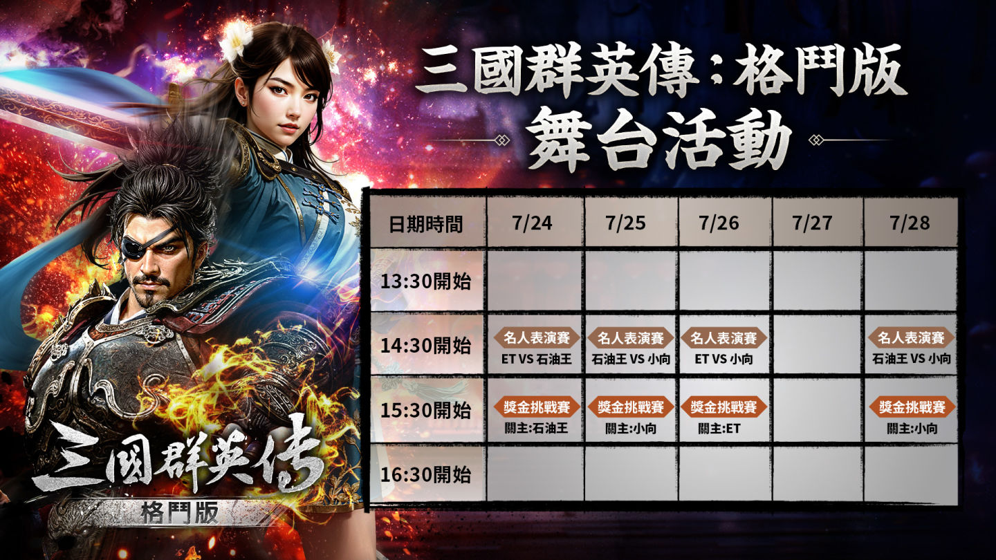 本次《三國群英傳:格鬥版》於 7 月 24 日、25 日、26 日及 28 日共舉辦四場「格鬥之巔挑戰賽」,每日將開放玩家現場報名參賽。凡年滿十八歲或經法定代理人簽署同意者,皆可至宇峻奧汀展位(D515-735)領取參賽號碼牌,參加限定名額的資格抽籤。