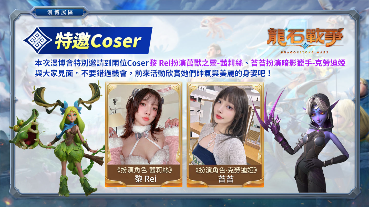 活動期間更特別邀請人氣 Coser 黎 Rei、Nori 苔苔,分別飾演遊戲中人氣角色「茜莉絲」及「克勞迪婭」角色,不僅展現角色魅力,更將與粉絲近距離互動拍照,讓現場玩家留下難忘的回憶。