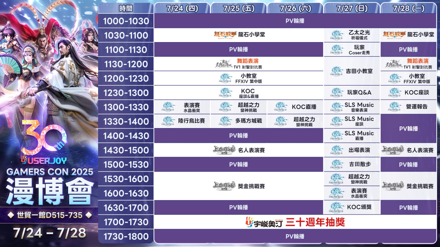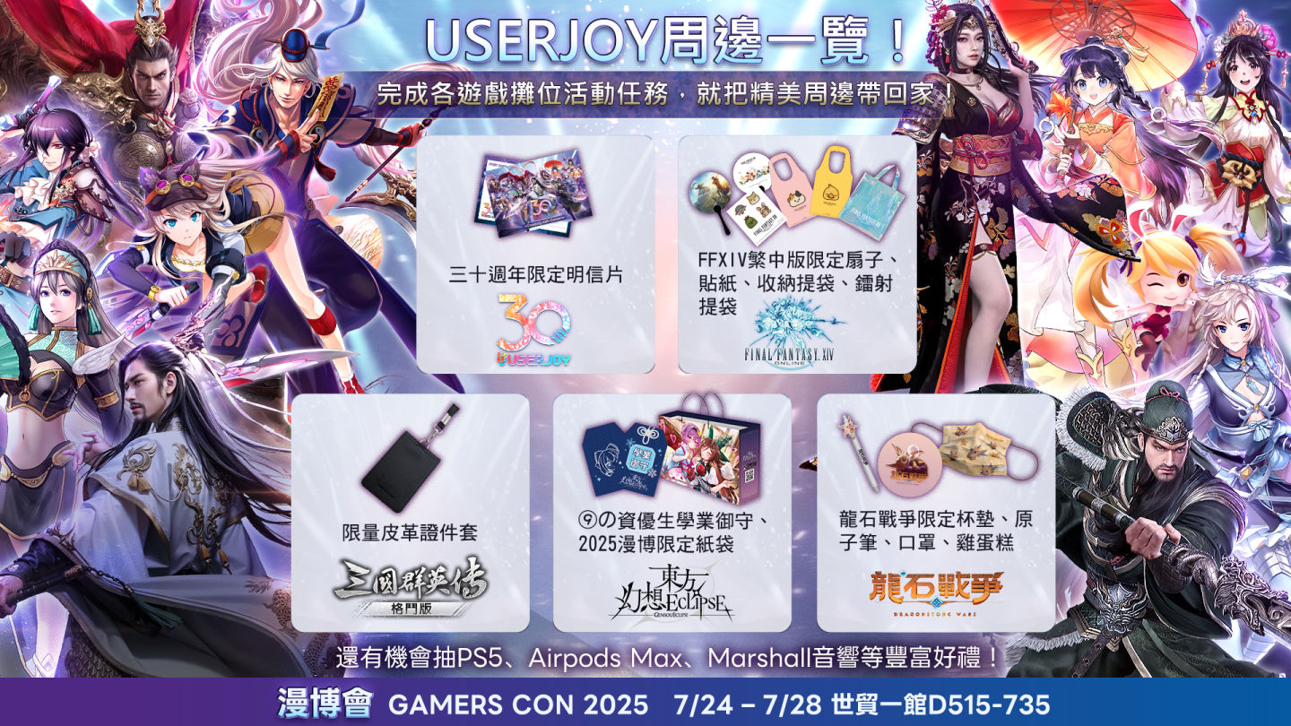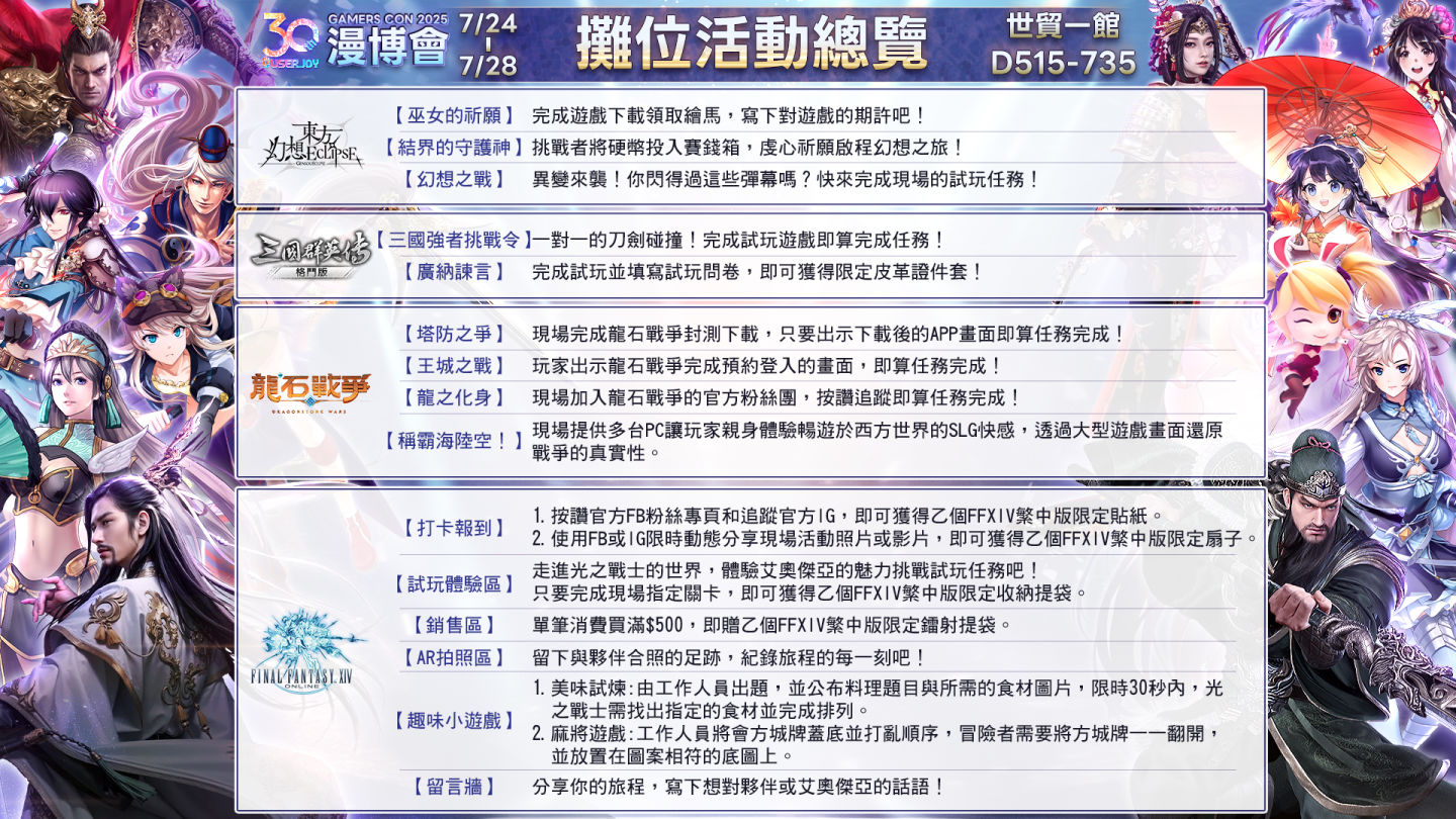 官方表示,在「宇峻奧汀」展區中,玩家將可親自體驗各款遊戲的互動任務,完成指定任務即可獲得對應限定周邊商品,並可至「UJ30 週年服務台」或「《FFXIV》繁中版展區服務台」獲得漫博會好康抽獎活動「好康集點」1 點。