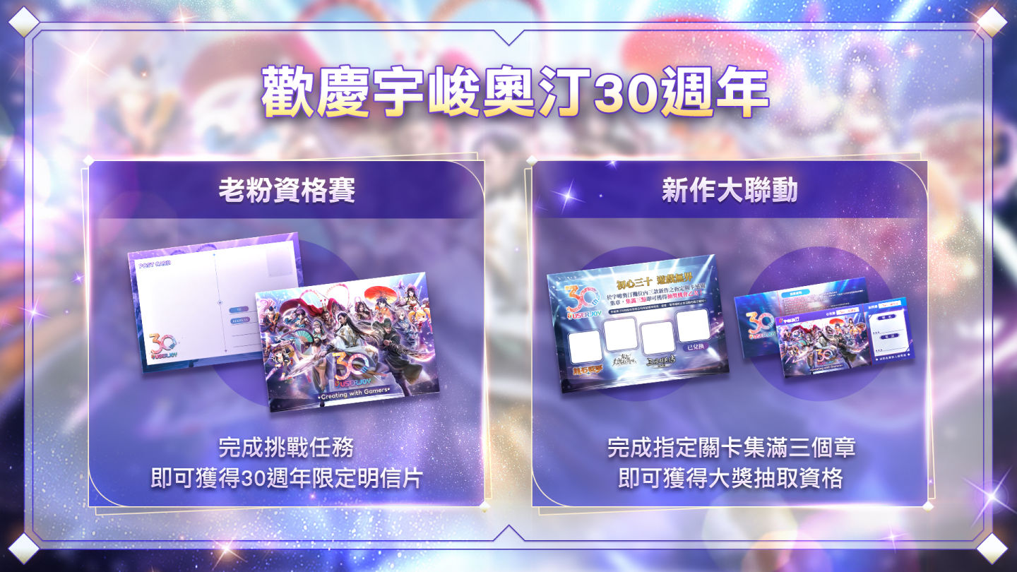在本次展會現場的「30 週年服務台」,特別設置了兩大互動活動「老粉資格賽」與「新作大聯動」,邀請玩家踴躍參與。凡完成「老粉資格賽」指定任務,即可獲得 30 週年限定明信片,紀錄玩家與宇峻奧汀一同走過的經典時光。