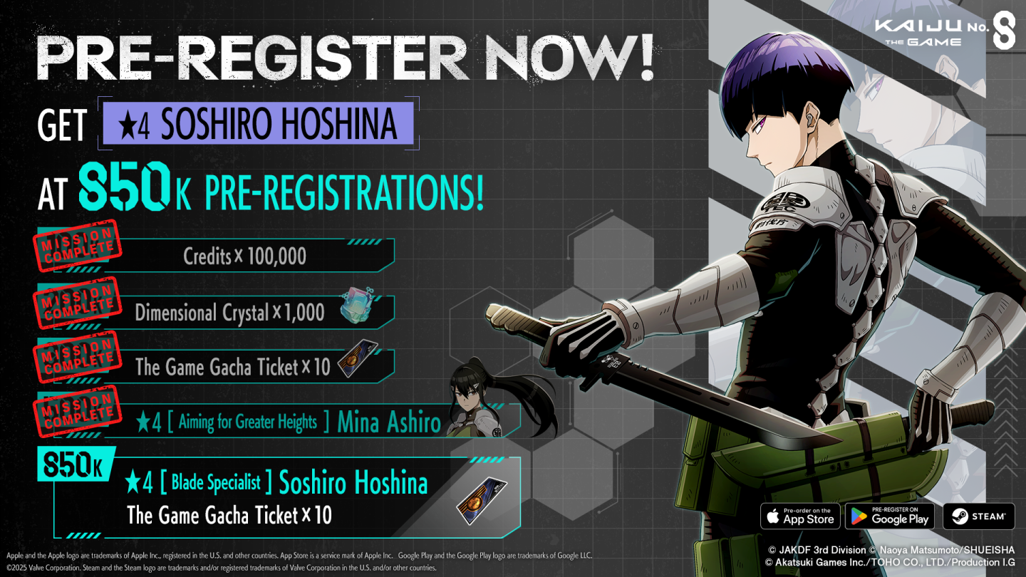 隨著50萬人目標的達成,官方已解鎖下一階段的事前預約獎勵。若預約人數達到85萬人,全體玩家將額外獲得可遊玩角色「★4[用刀的專家]保科宗四郎」 。