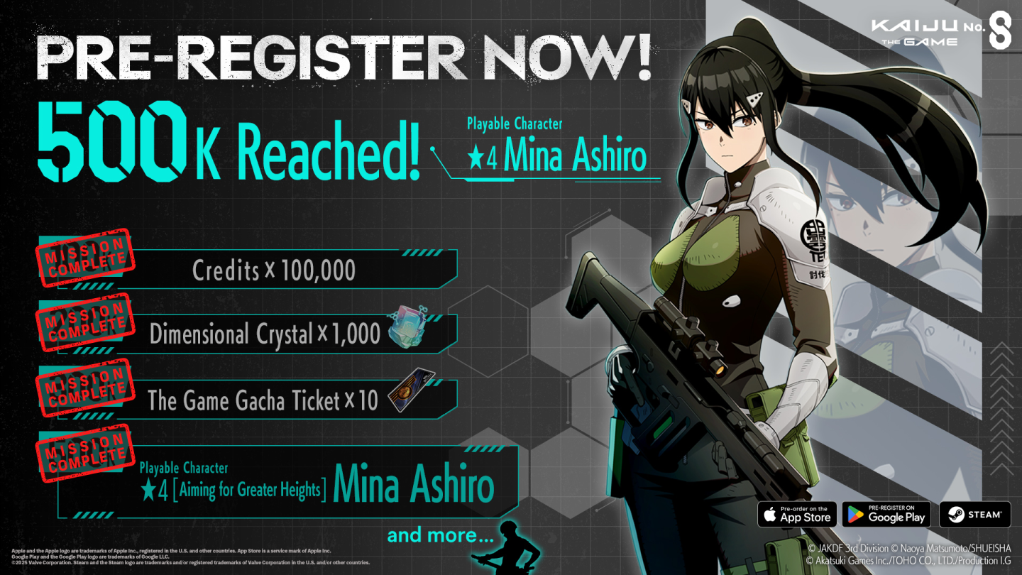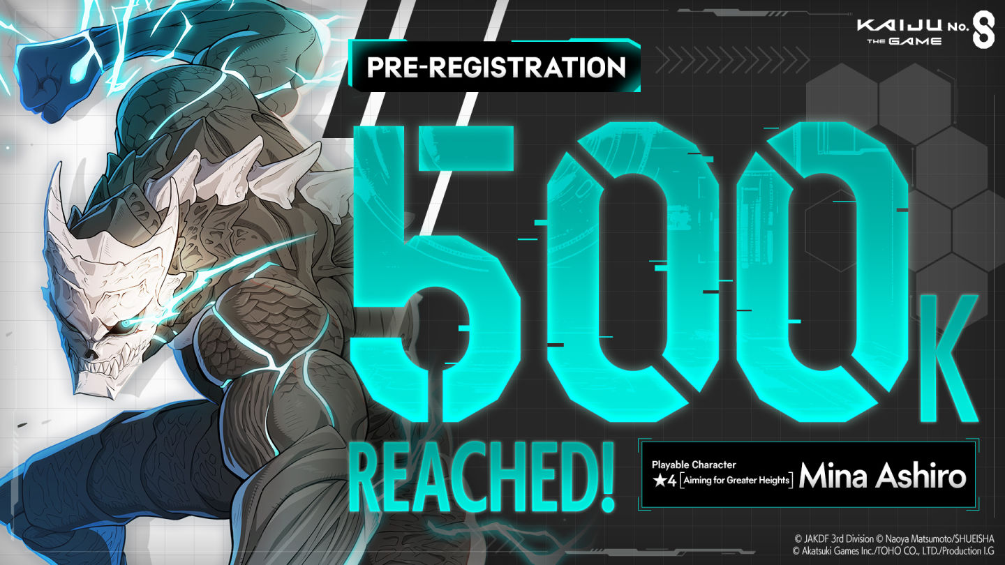 由Akatsuki Games、TOHO及Production I.G共同製作的智慧型手機與PC遊戲《怪獸8號 THE GAME》,其全球事前預約人數已突破50萬人。為此,遊戲正式上市後將確定贈送全體玩家可遊玩角色「★4[邁向更高的境界]亞白米娜」及其他遊戲道具獎勵 。