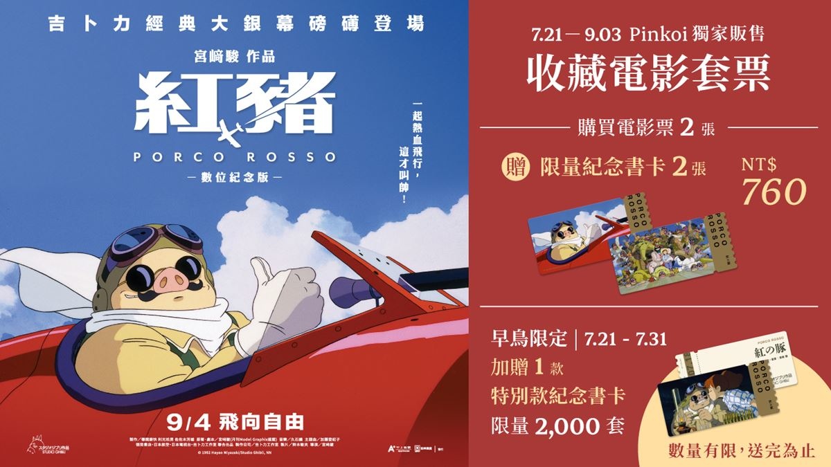 為紀念《紅豬》重返大銀幕,甲上娛樂攜手 Pinkoi 推出全球唯一復古紀念票卡,精選電影中三個經典瞬間——「眾星拱月」、「紅色傳奇」、「羞澀印記」,收藏屬於這段浪漫與孤獨交織的飛行傳說,紀念套票將於今晚 6 點開賣,至 7/31 前下單加贈早鳥限定「羞澀印記」特別款紀念票卡,僅限量 2 千套,售完為止,現在就將《紅豬》不朽的紅色傳奇帶回家,讓故事持續在心中飛翔。《紅豬》將於 9 月 4 日在台上映,請影迷切勿錯過大銀幕體驗自由飛行的浪漫。