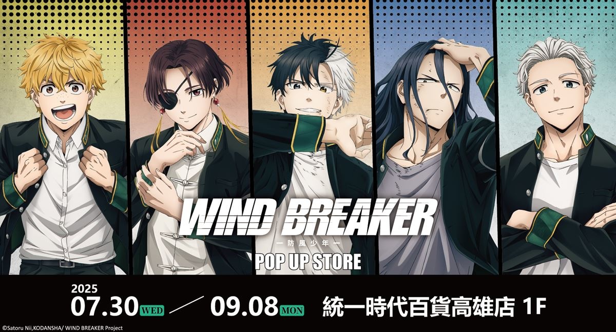 粉絲們別傷心!為了道別《WIND BREAKER 防風少年》動畫第二季的結束,「WIND BREAKER 防風少年快閃店」7/30-9/8 登場統一時代百貨高雄店,一進店就可以看到「梅宮、椿野和柊」三位防風鈴核心成員們在門口迎接大家,往裡走還有一整面集結桐生、蘇枋、榆井、椿野、梶、杉下和櫻等的「防風鈴區」,不合照怎麼可以呢?最後還要到「七大角色櫥窗」好想加入他們並肩同行,感受青春的熱血!
