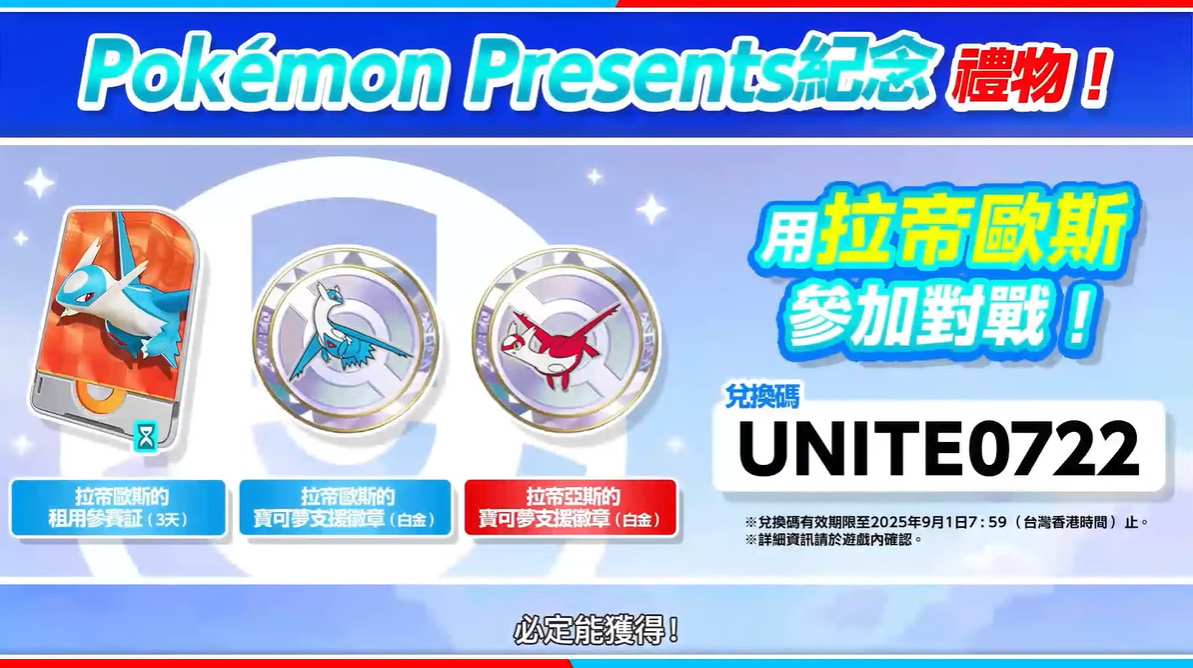 另外,官方將會贈送兌換碼「UNITE0722」,兌換後可獲得拉帝歐斯的租用參賽證(3 天)/拉帝歐斯的寶可夢支援徽章(白金)/拉帝亞斯的寶可夢支援徽章(白金)等特典作為禮物。
