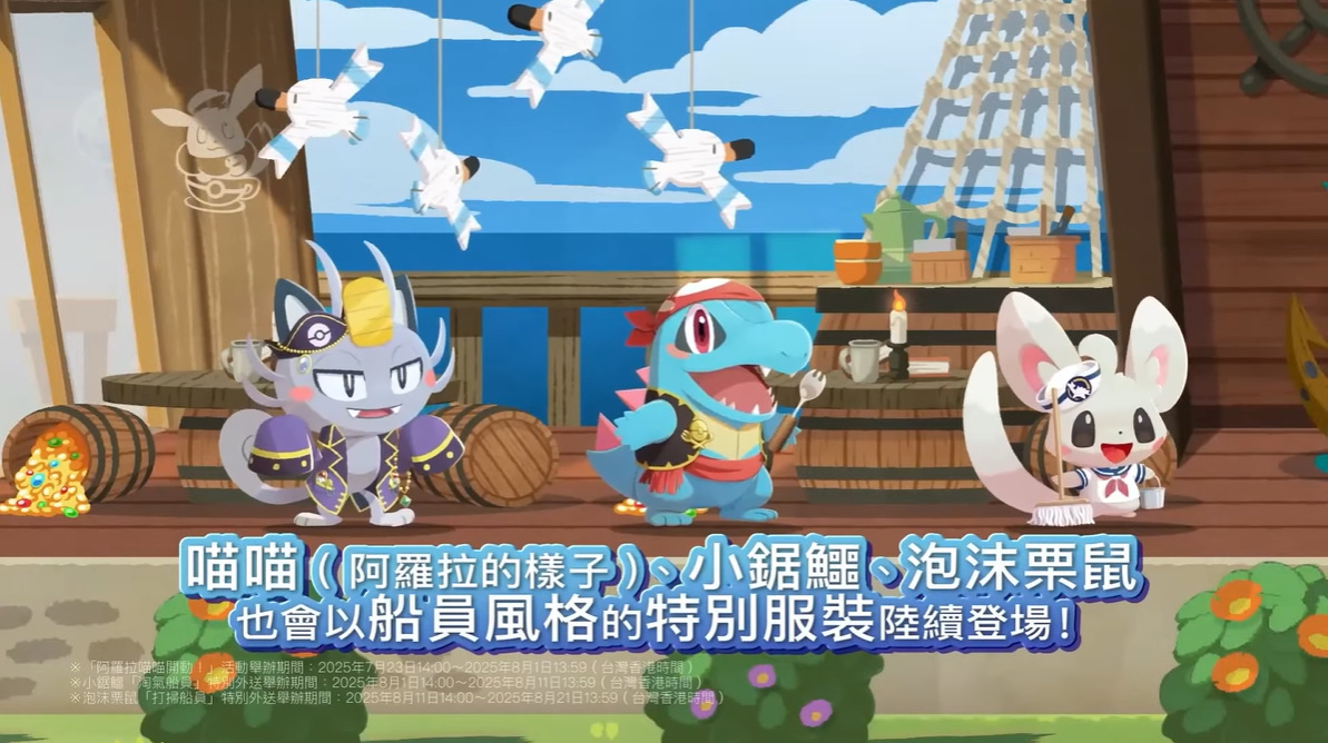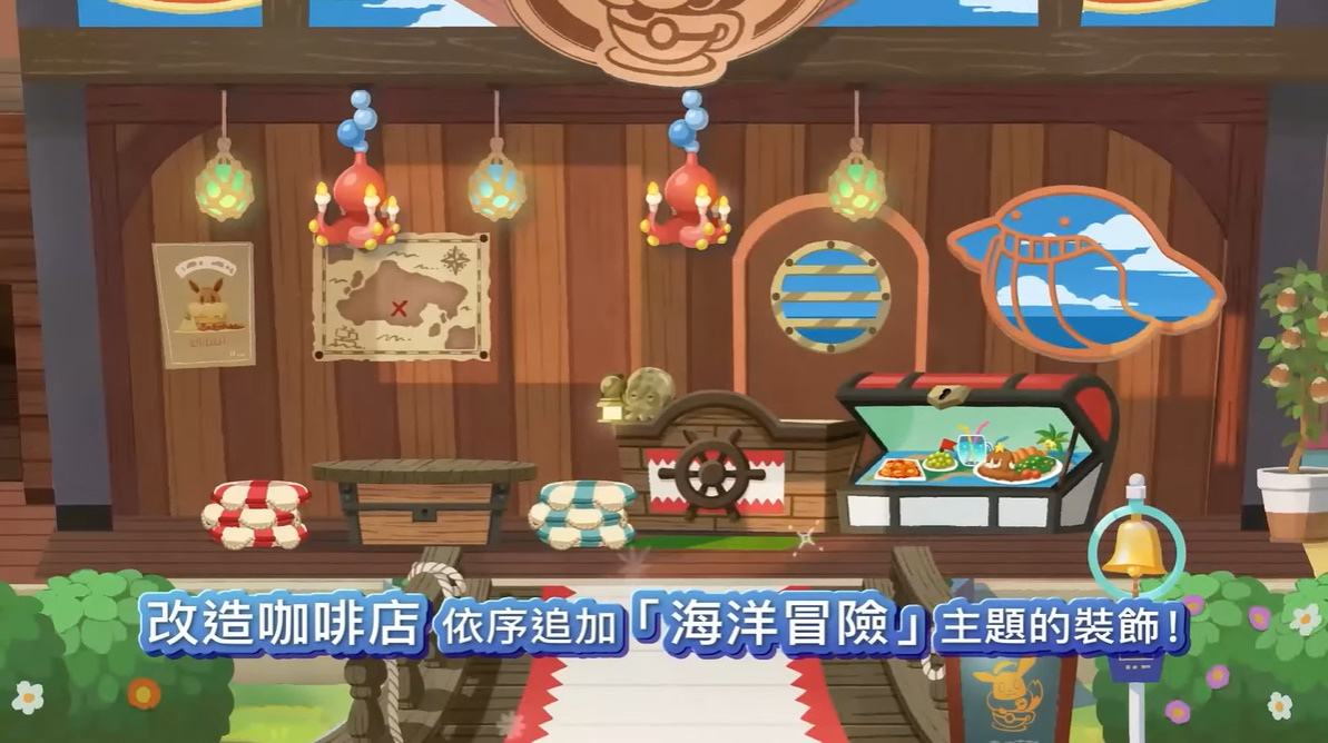 同時,改造咖啡店將依序追加「海洋冒險」主題裝飾。而喵喵(阿羅拉的樣子)、小鋸鱷、泡沫栗鼠也會以船員風格的特別服裝陸續登場。