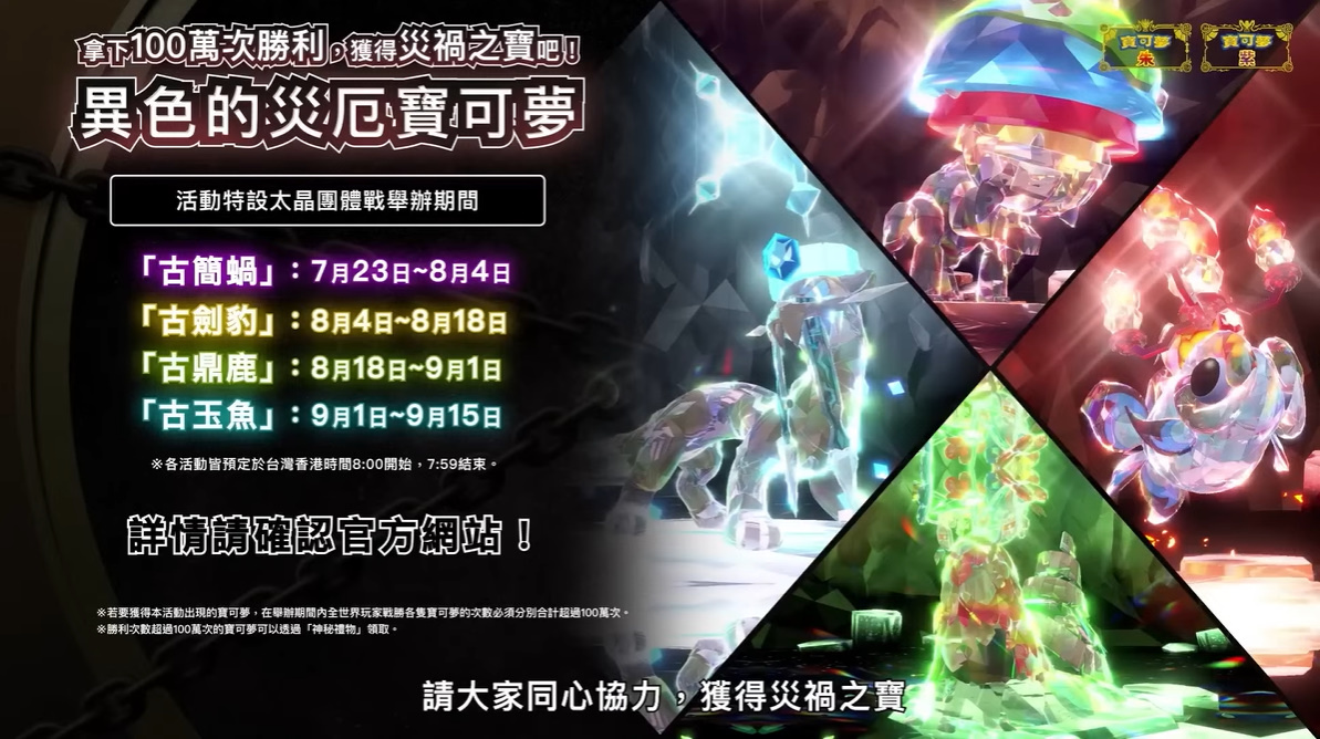 此外,官方將在《寶可夢 朱/紫》舉辦活動特設太晶團體戰。本次「古簡蝸/古劍豹/古鼎鹿/古玉魚」等異色災厄寶可夢的太晶團體戰,不同於一般太晶團體戰,玩家需要同心協力每隻都拿下 100 萬次勝利才能捕捉。