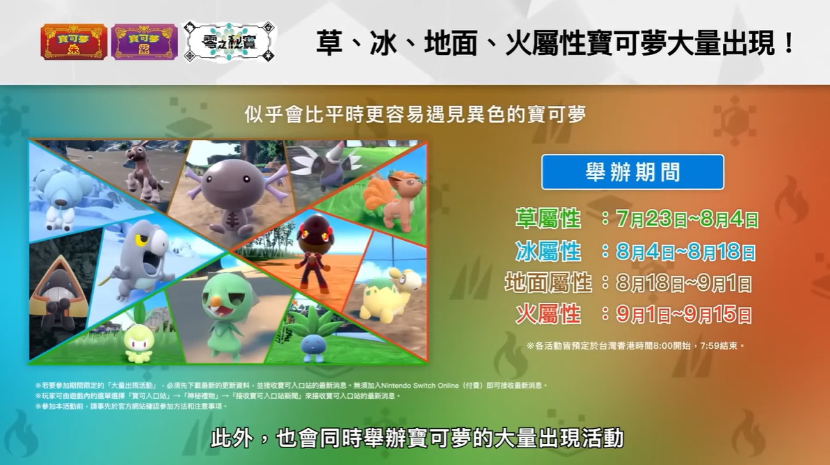 而且官方也將會推出草/冰/地面/火屬性寶可夢的大量出現活動,在活動期間將有機會更容易遇見異色寶可夢,玩家可以把握機會來好好捕捉。