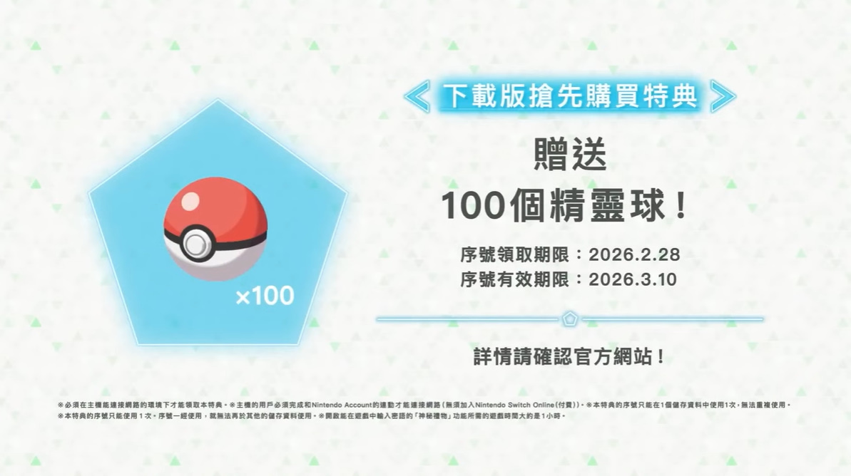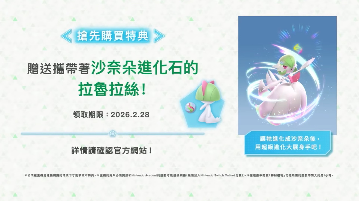 目前本作預定將於 2025 年 10 月 16 日起,在 Nintendo Switch 2/Nintendo Switch 推出,現在也已開放玩家預購。同時,官方還將會贈送攜帶沙奈朵進化石的拉魯拉絲作為搶先購買特典,而下載版玩家則是可獲得 100 個精靈球作為下載版搶先購買特典,玩家們可別錯過。