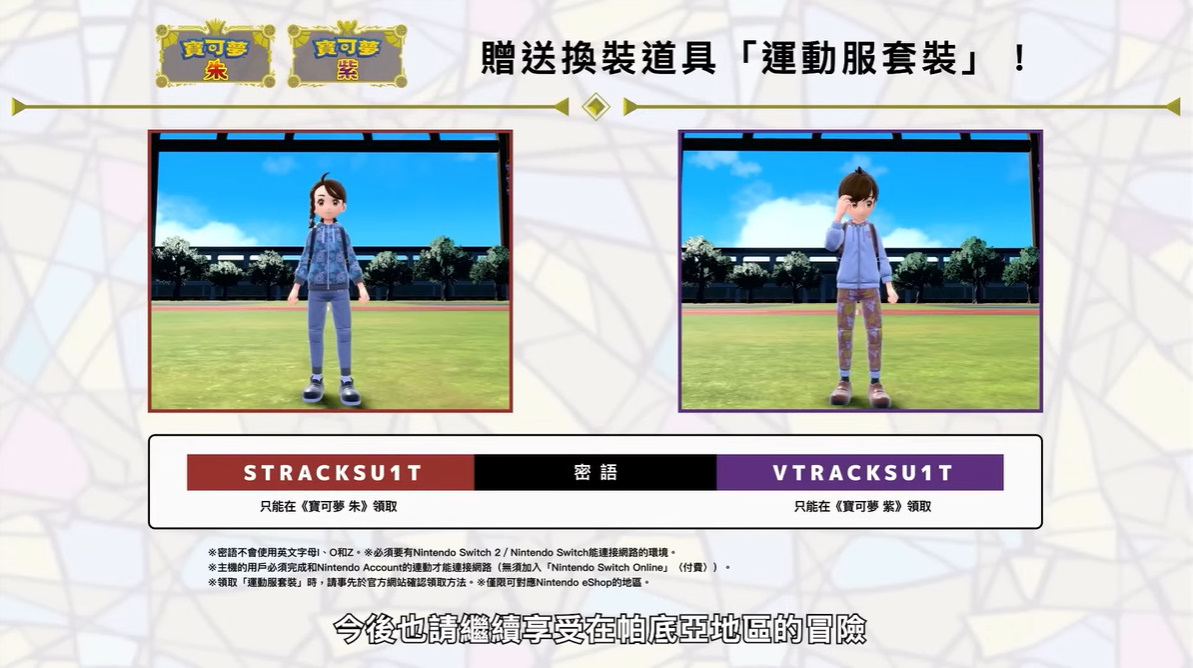 另外,官方也將會贈送換裝道具「運動服套裝」,玩家須輸入密語「STRACKSU1T(僅限《寶可夢 朱》使用)/VTRACKSUIT(僅限《寶可夢 紫》使用)」,玩家可以現在就來輸入領取使用。