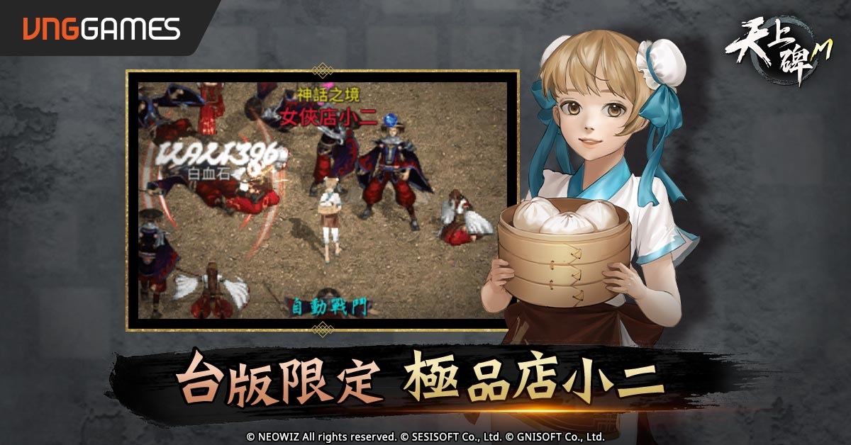 《天上碑M》玩家最熟悉的「店小二」,在 1.5 週年化成幻影術,伴在少俠身邊提供戰力補給!店小二階級為龍麟器,能力值:攻擊速度(%)50、聲望經驗值(%)30、銅錢獲得量(%)30、道具掉落率(%)20、PVE 護身(%)5,即日起只要參加簽到活動,第七天即可免費獲得,千萬別錯過此良機!