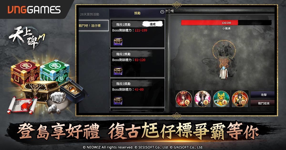 《天上碑M》活動期間狩獵怪物可獲得「尪仔標箱」,開啟後可隨機取得 30 種不同尪仔標,少俠可使用尪仔標挑戰活動 Boss,組合特定尪仔標還能觸發額外組合效果,造成追加傷害並獲得獎勵。擊敗 Boss 將根據血量階段發放「戰鬥獎勵箱」與「Boss 消滅箱」。