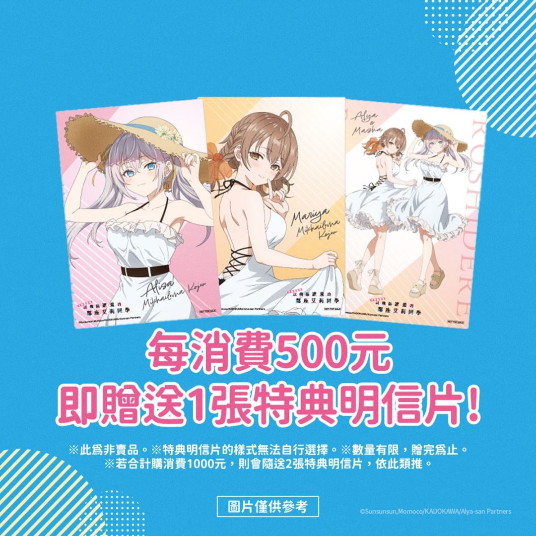美麗華快閃店內以人氣動畫《遮羞艾莉》為主軸強勢登場,入場時便可以與門口的「艾莉同學」立牌合影,盡情選購主角艾莉、瑪夏的周邊商品;現場備有多款日本進口的限量獨家商品,每消費滿 500 元就送特典明信片,絕對讓粉絲收穫滿滿。