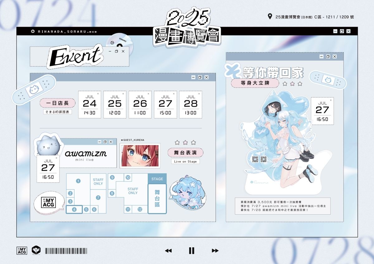 除了靜態展出,水縹そまる與同樣來自台灣的新銳電子音樂人暗雨 Anyu 組成音樂團體 awamizm,於 7 月 27 日(日)在「日本館舞台」舉辦 mini live 音樂演出,將療癒系透明女聲與多種音樂風格風完美融合,打造 ACG 展難得一見的專業音樂現場!